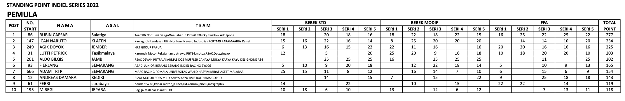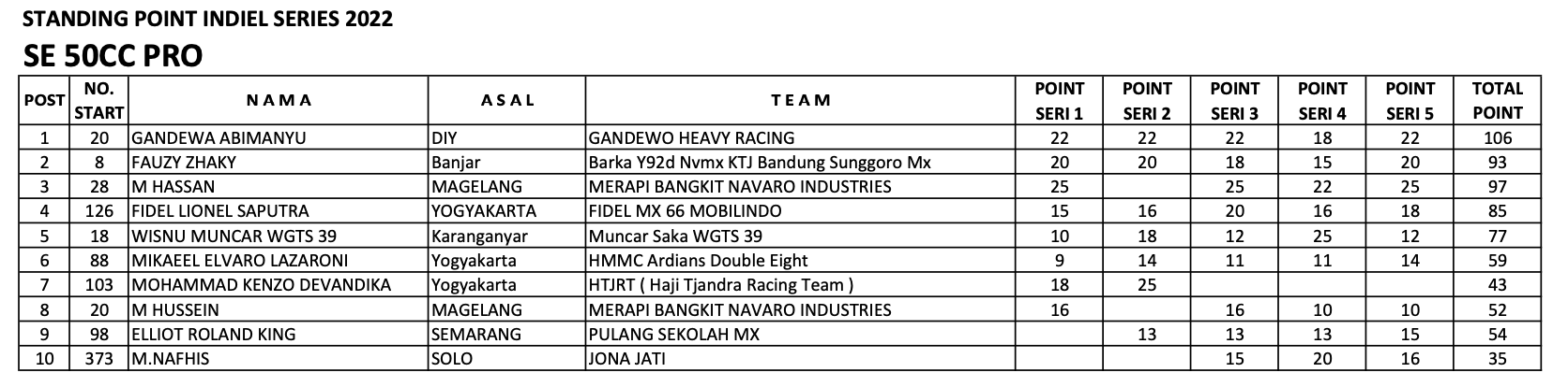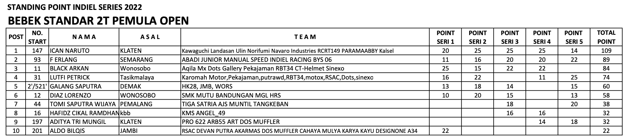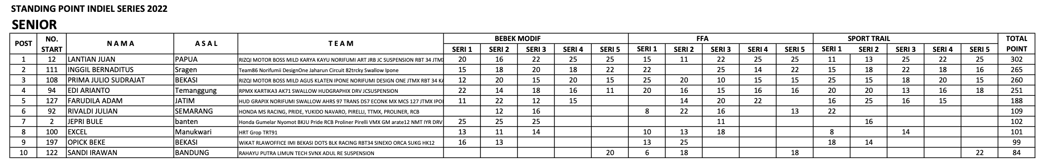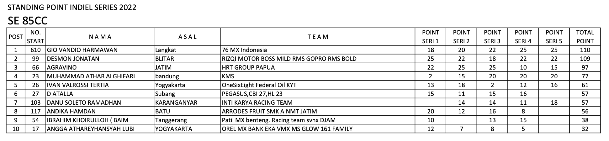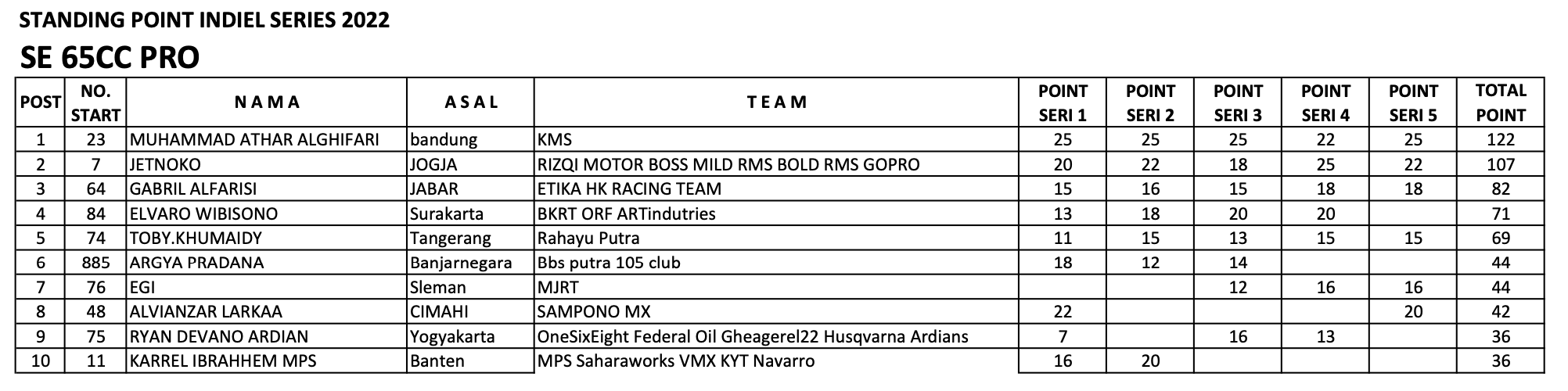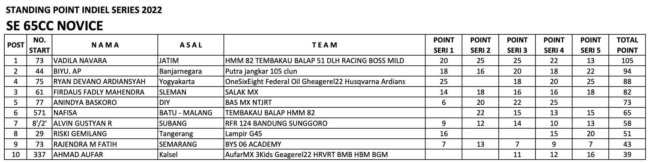 GRASSTRACK ID – Berikut merupakan daftar Juara Umum total poin Indiel Series Championship 2022. Kelas seri meliputi SE 50CC, SE 65 CC Novice, SE 65 Pro, SE 85CC, Bebek Std 2 Tak, Pemula, dan Senior.