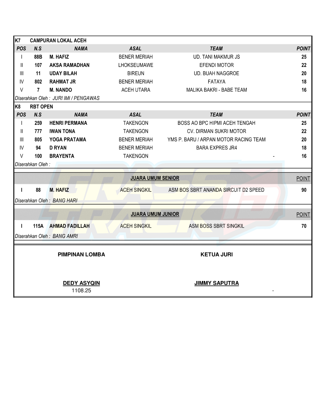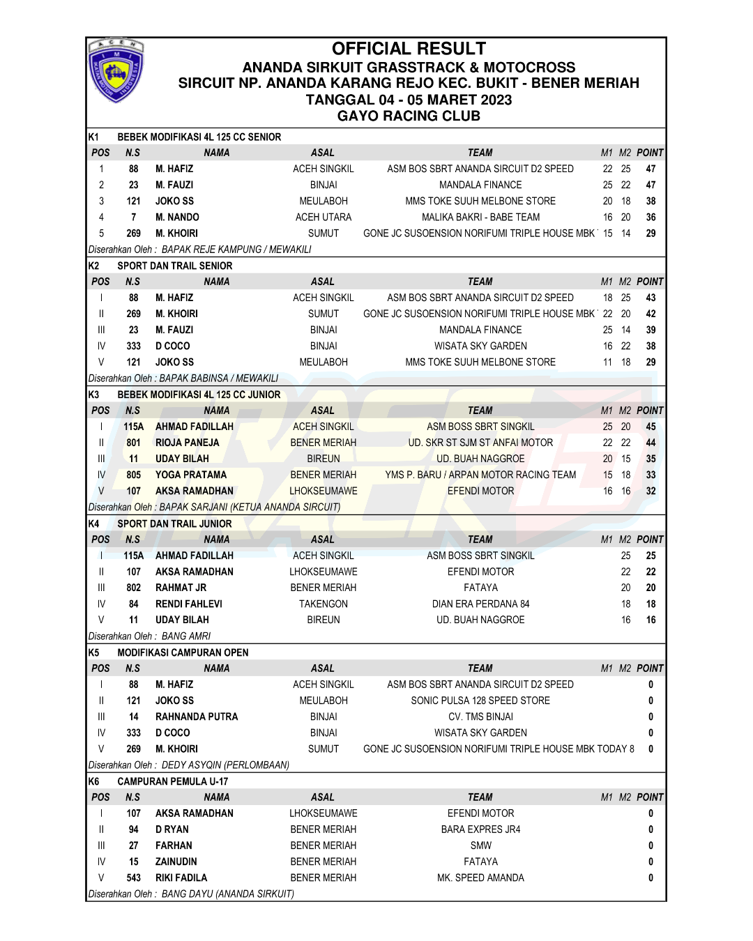 GRASSTRACK ID – Hasil Ananda Sirkuit Grasstrack Motocross 2023 tanggal 4-5 Maret 2023 di Sirkuit NP Ananda Karang Rejo, Bener Meriah, Aceh