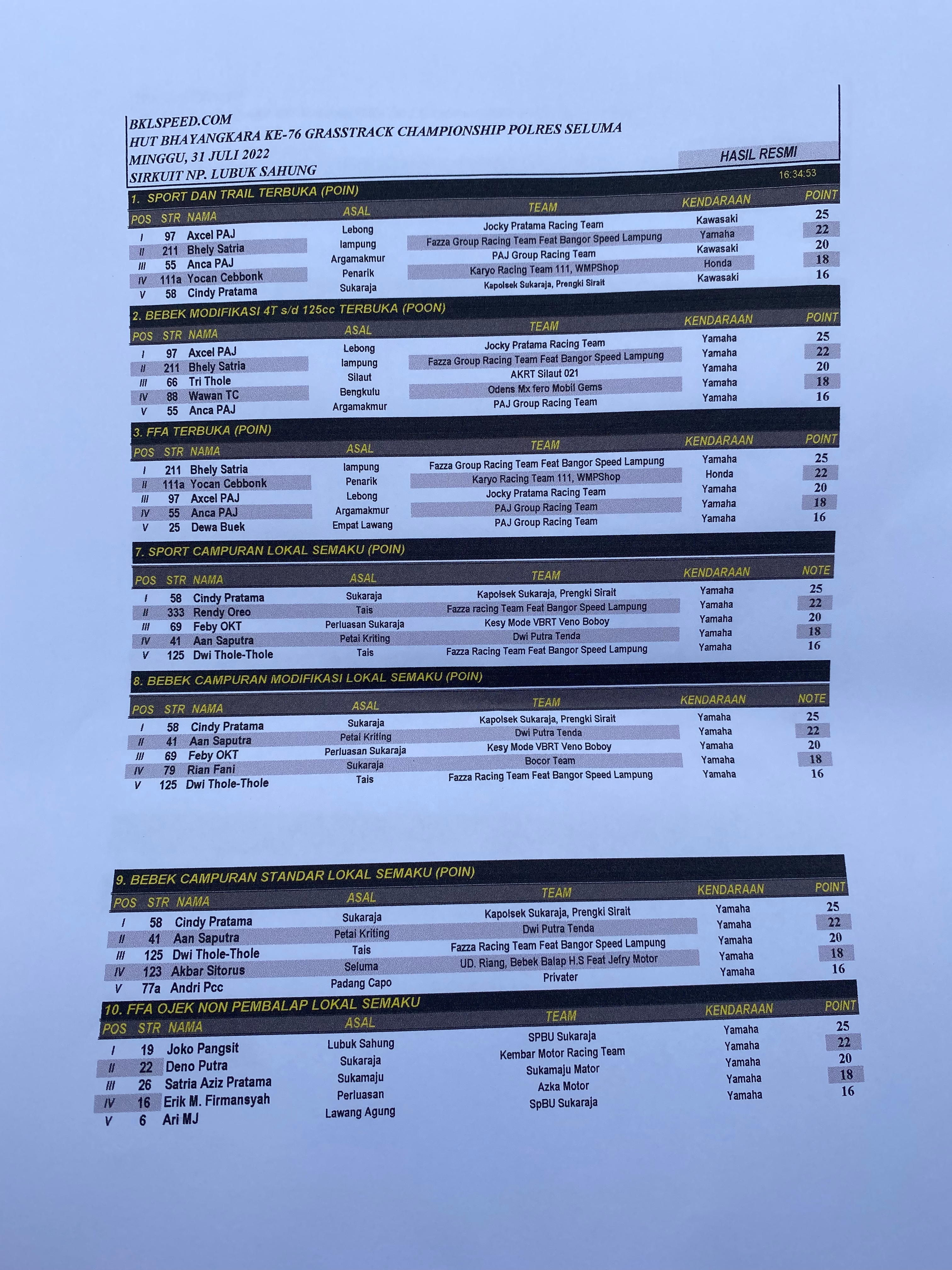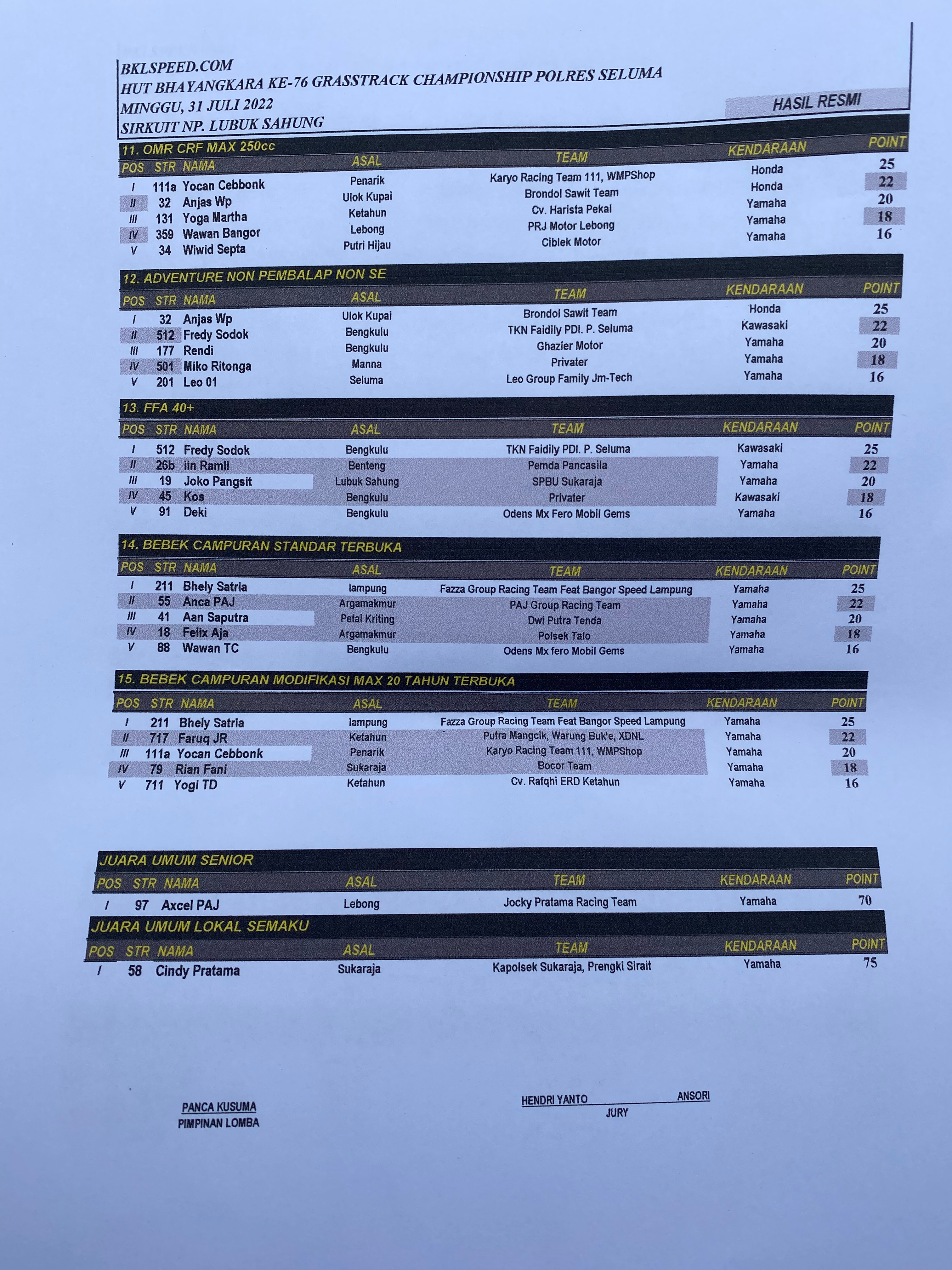 GRASSTRACK ID – Berikut hasil BKL Speed HUT Bhayangkara ke-76 Grasstrack Polres Seluma tanggal 30-31 Juli 2022 di Sirkuit NP Lubuk Sahung, Bengkulu.