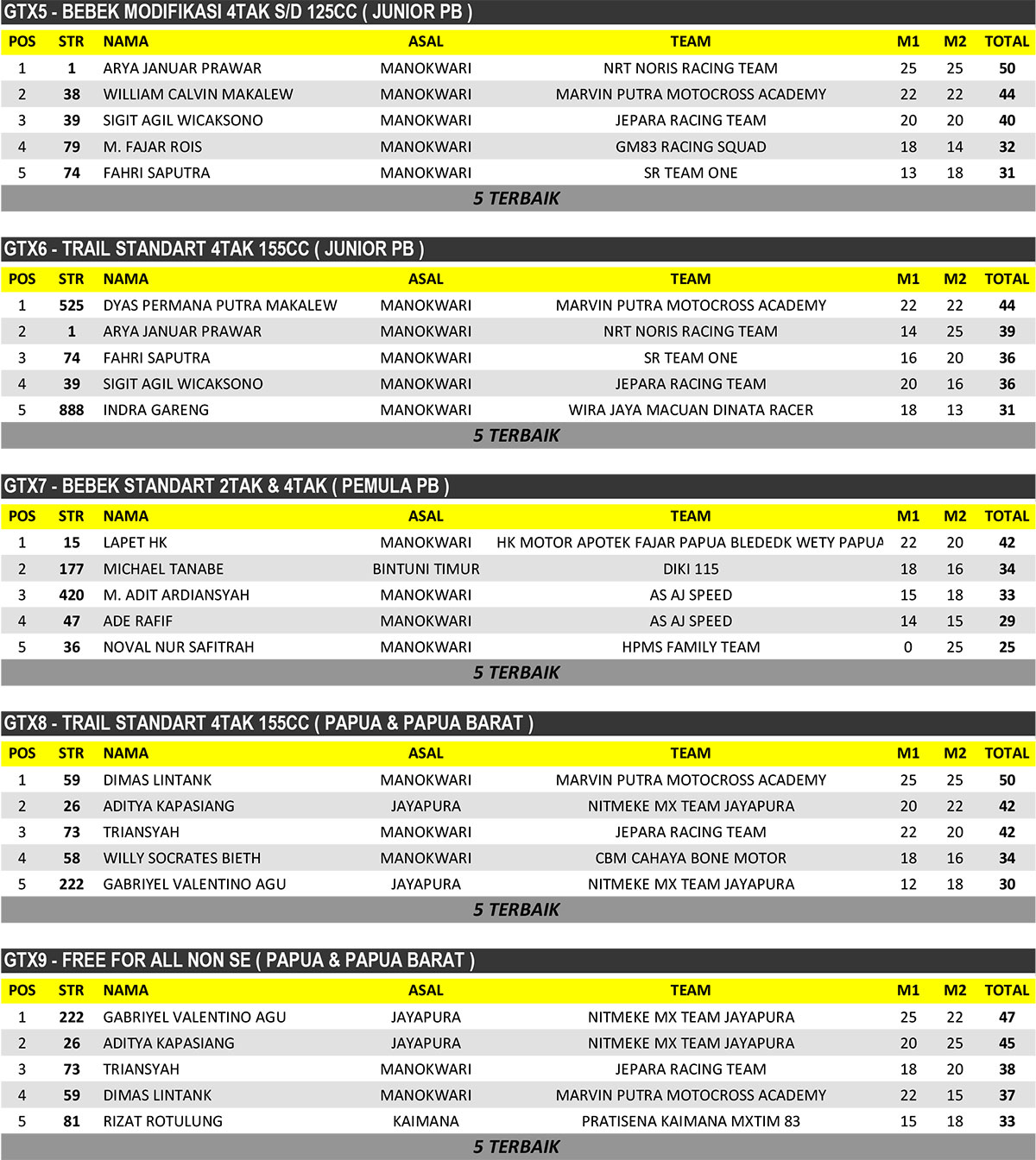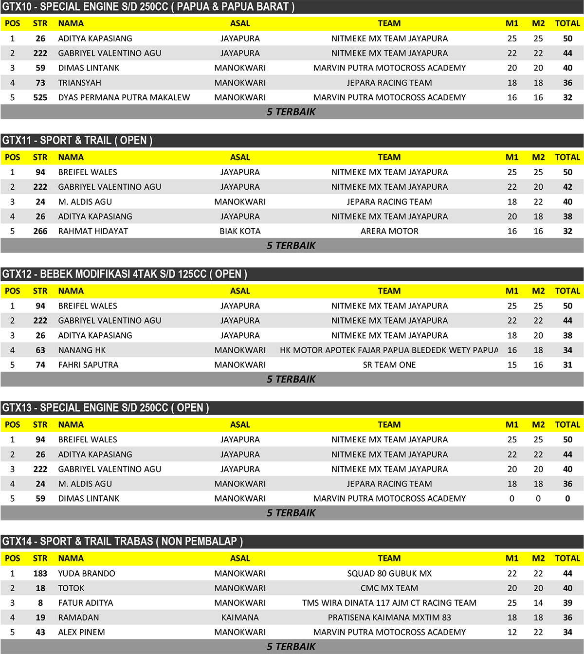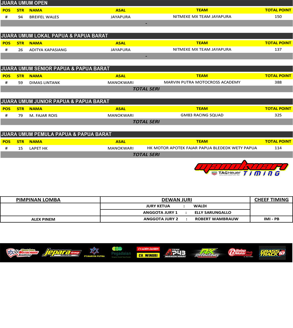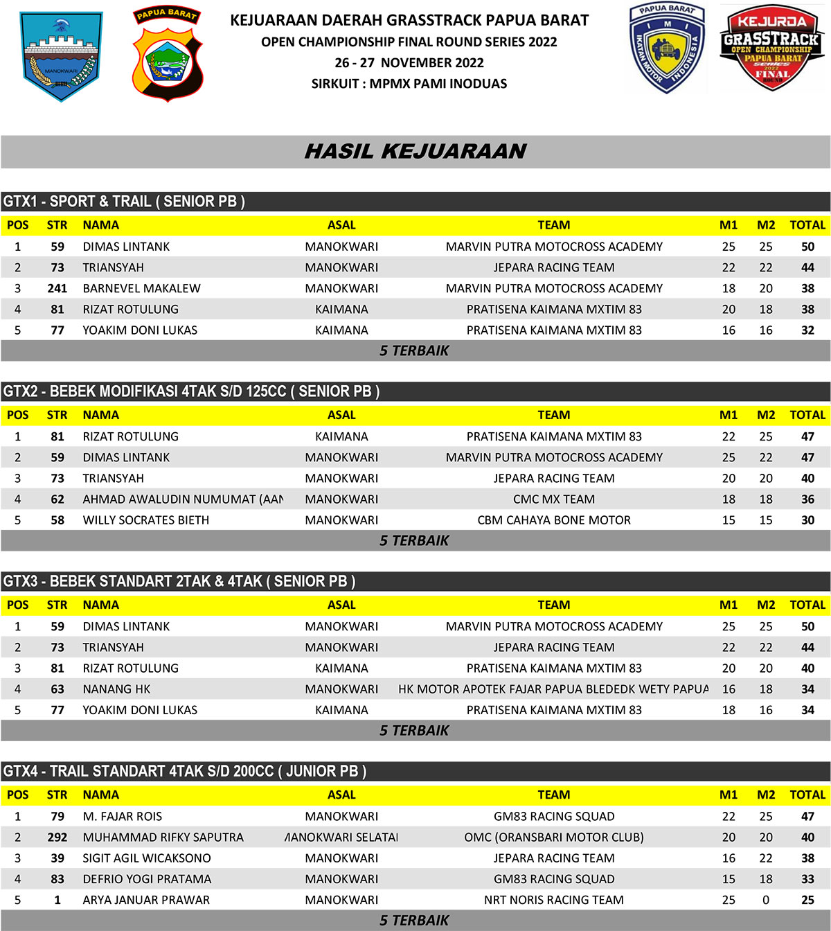 GRASSTRACK ID – Berikut hasil putaran final kejurda grasstrack papua barat open championship 2022 yang digelar tanggal 26-27 november 2022 di Sirkuit MPMX Pami Inoduas Papua Barat.