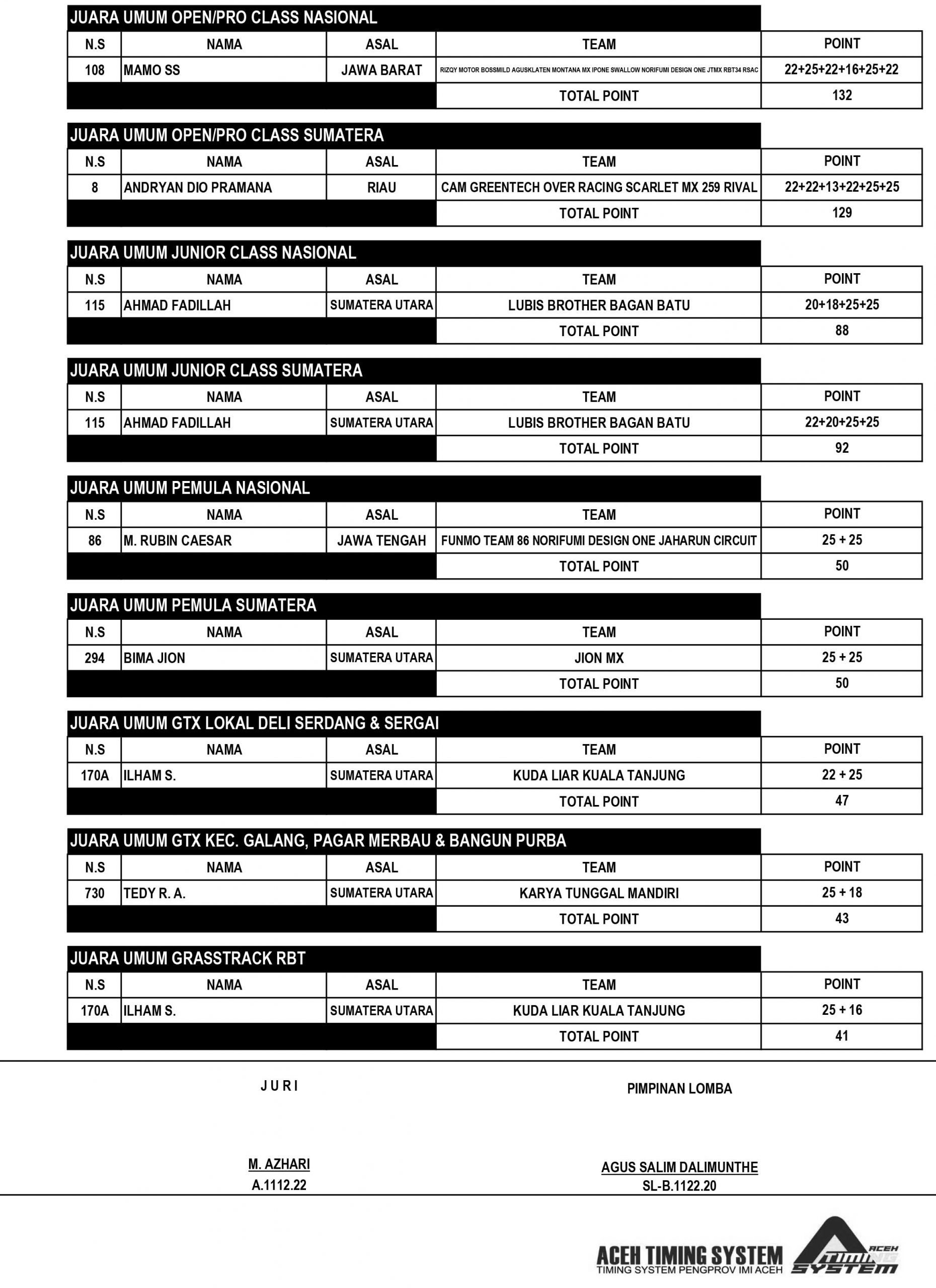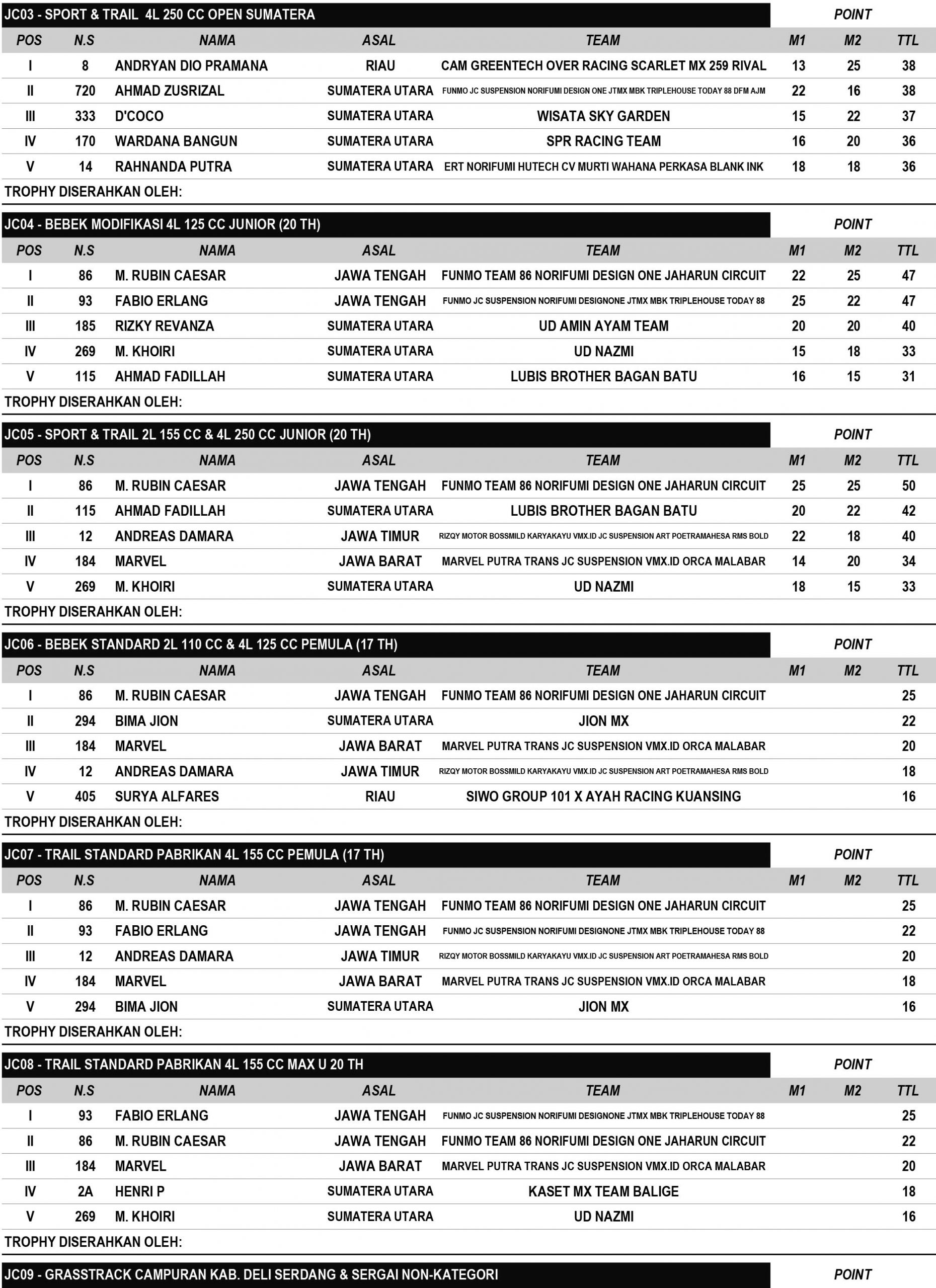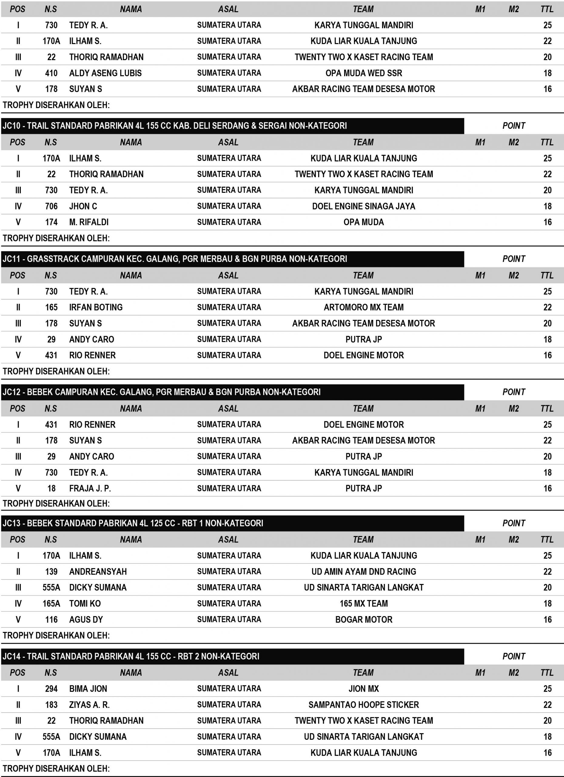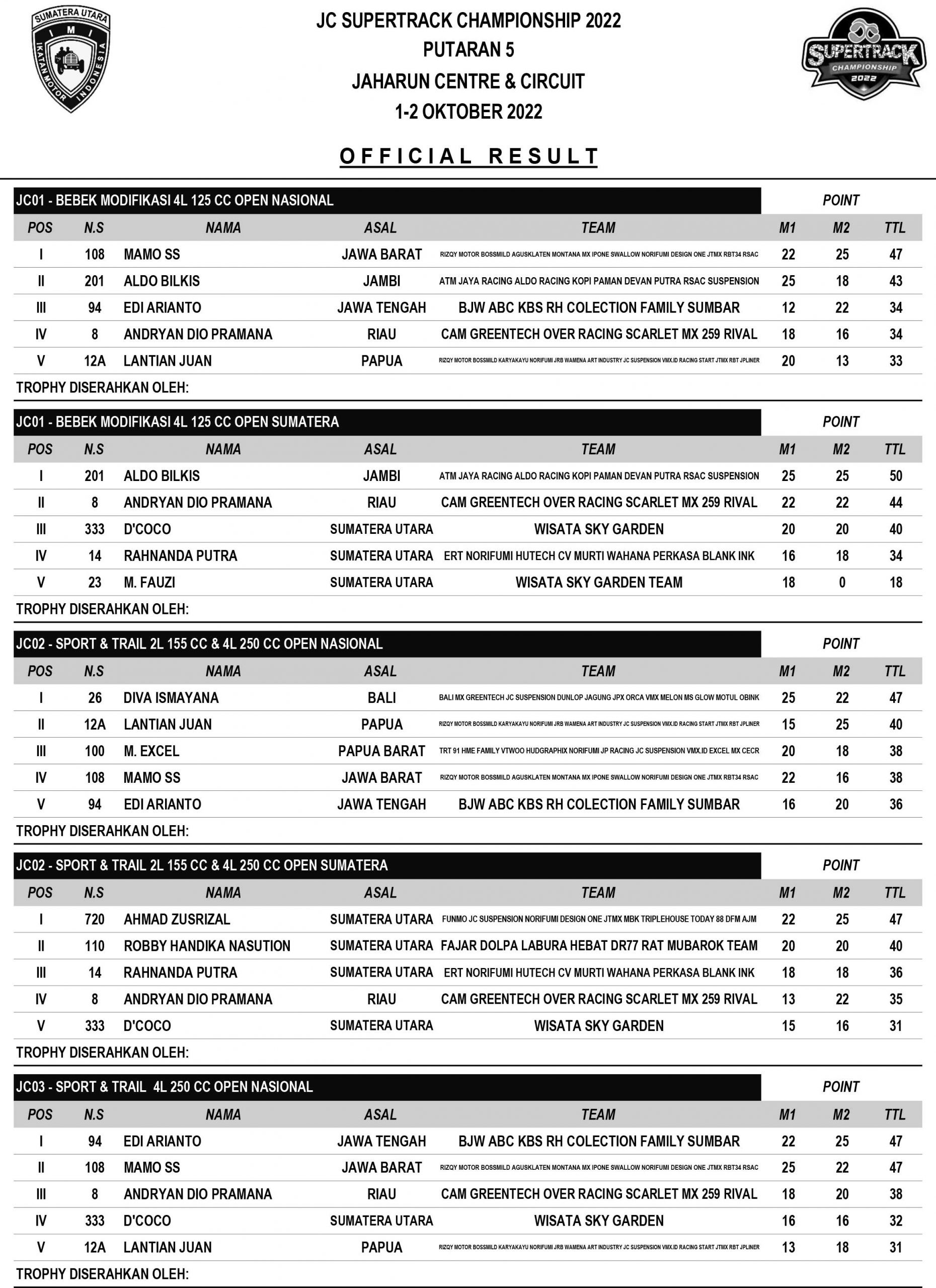 GRASSTRACK ID – Berikut hasil Grand Final JC Supertrack Championship 2022 tanggal 1-2 Oktober 2022 di Jaharun Circuit – Sumatera Utara.