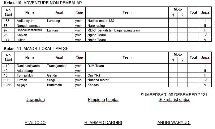 GRASSTRACK ID – Berikut hasil resmi kejuaraan grasstrack sumbersari cup 2021 di Sirkuit Salsa Putra Desa Sumbersari, Kec Sragi Lampung Selatan tanggal 7-8 Desember 2021.