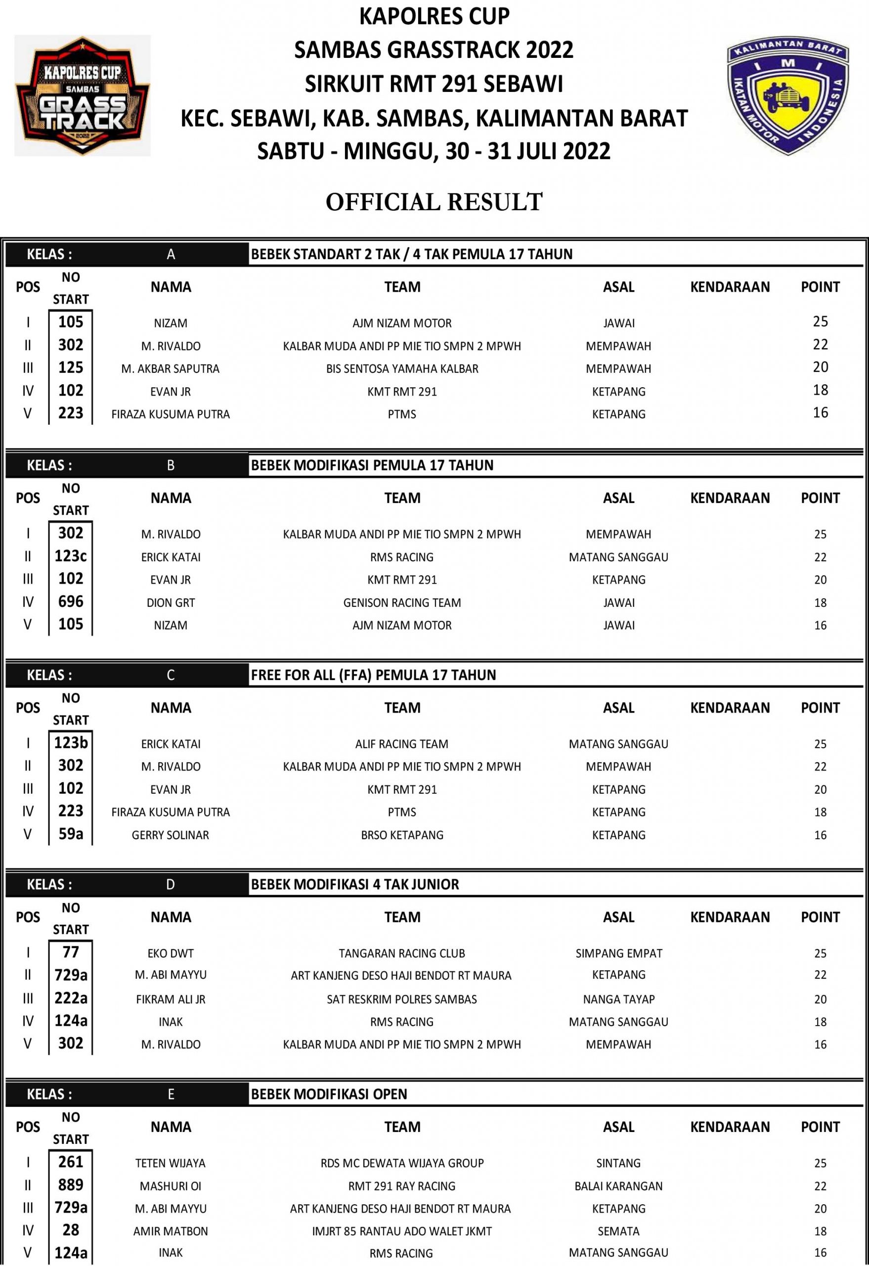 GRASSTRACK ID – Berikut hasil kapolres cup sambas grasstrack 2022 tanggal 30-31 Juli 2022 di Sirkuit RMT 291 Sebawi, Kalimantan Barat.