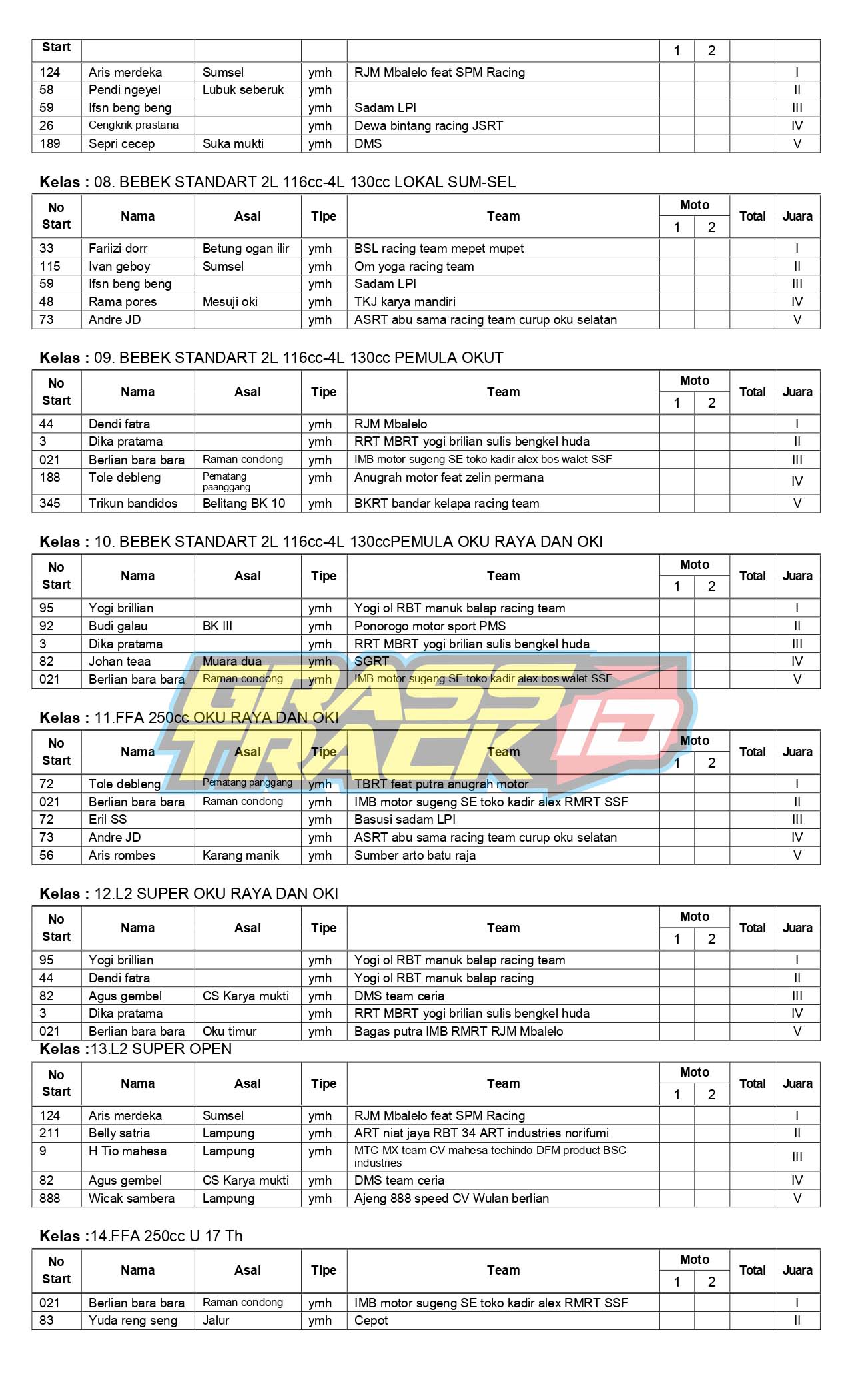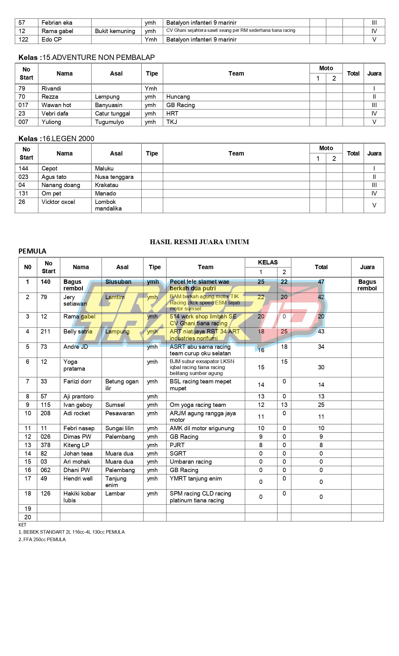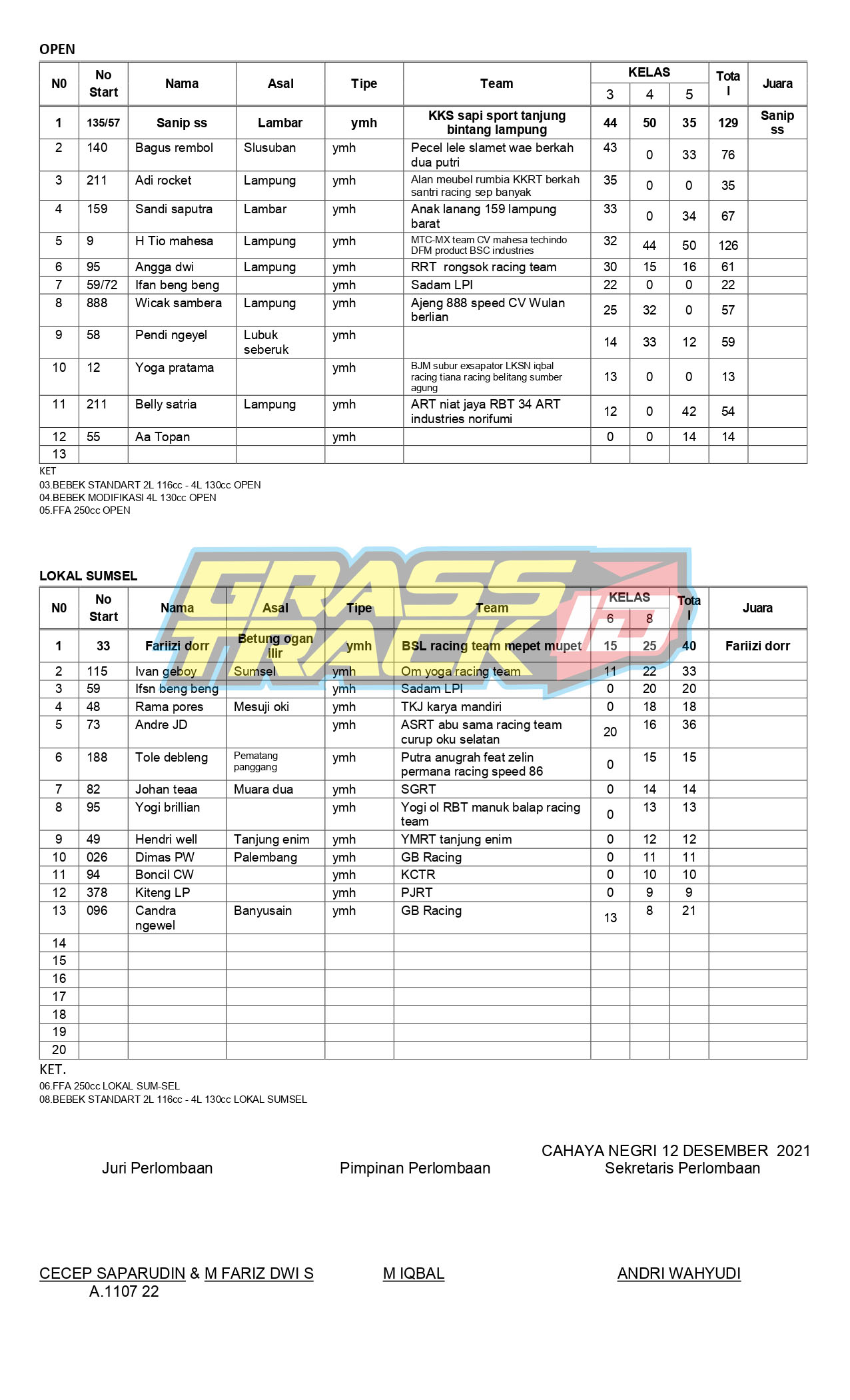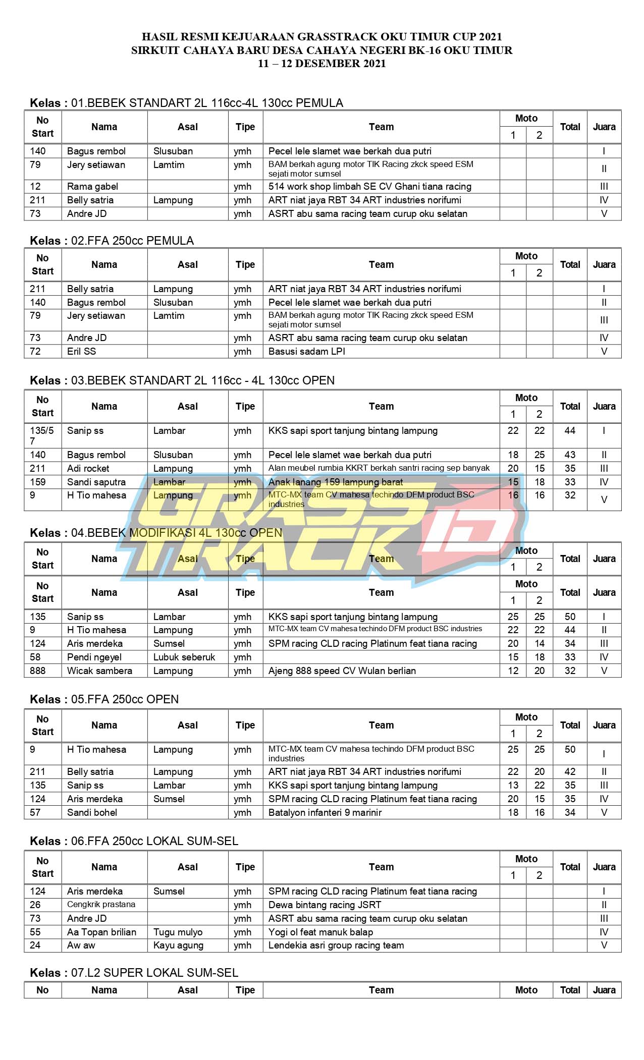 Berikut Hasil Resmi Kejuaraan Grasstrack Oku Timur Cup 2021 yang digelar pada tanggal 11-12 Desember 2021 di Sirkuit Cahaya Baru, Oku Timur.