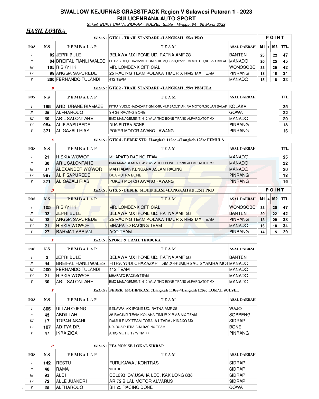 GRASSTRACK ID – Hasil Kejurnas Grasstrack 2023 Region 5 Putaran 1 tanggal 4-5 Maret 2023 di Sirkuit Bukit Cinta, Sidrap, Sulawesi Selatan.