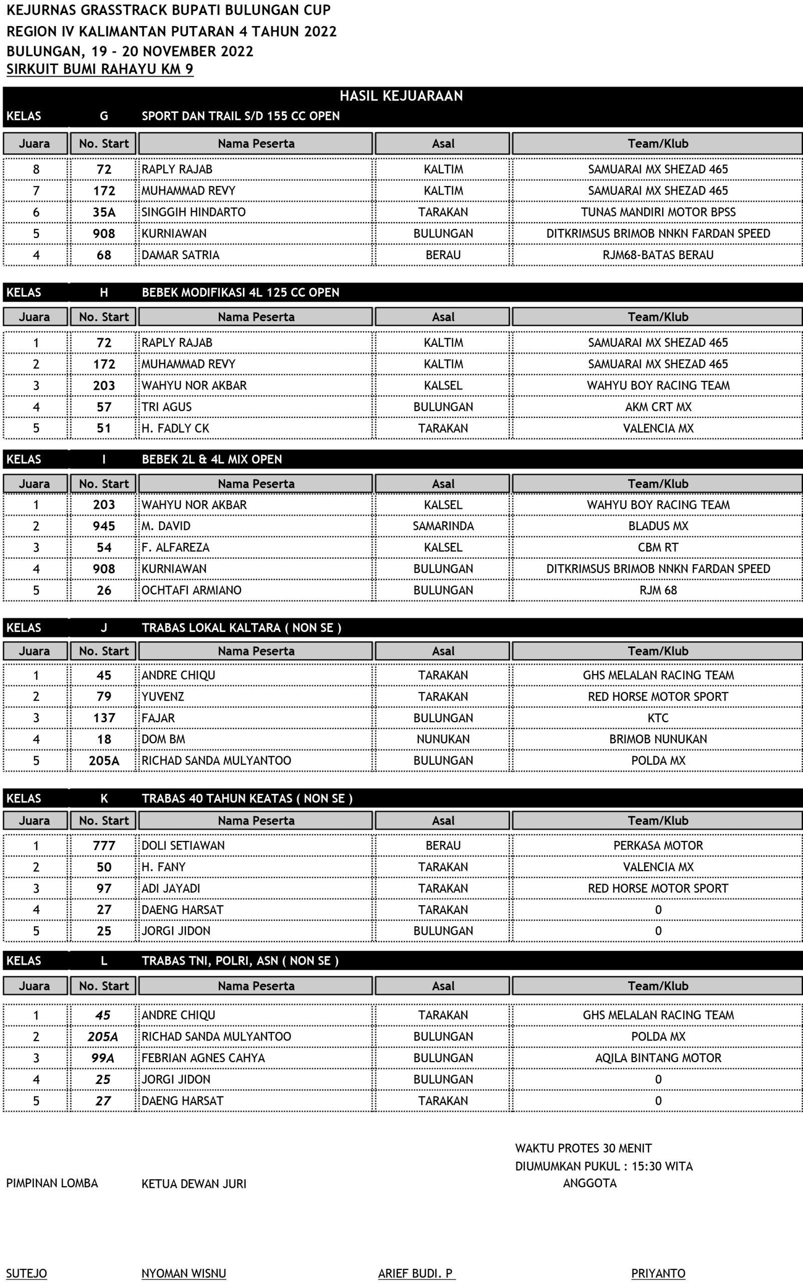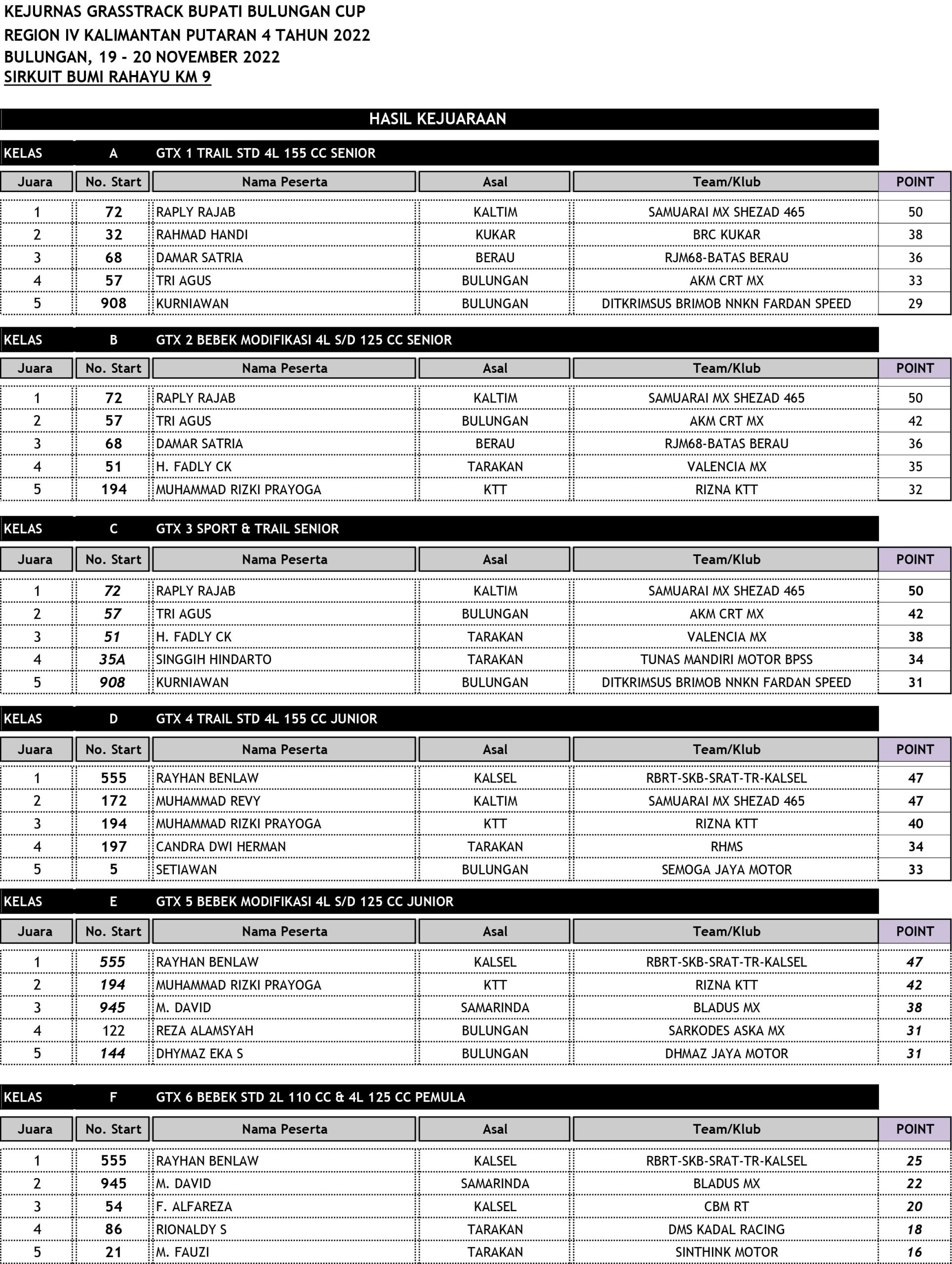 GRASSTRACK ID – Berikut hasil kejurnas grasstrack bupati bulungan cup region iv kalimantan putaran 4 tanggal 19-20 November 2022 di Sirkuit Bumi Rahayu KM 9 Kalimantan Utara.