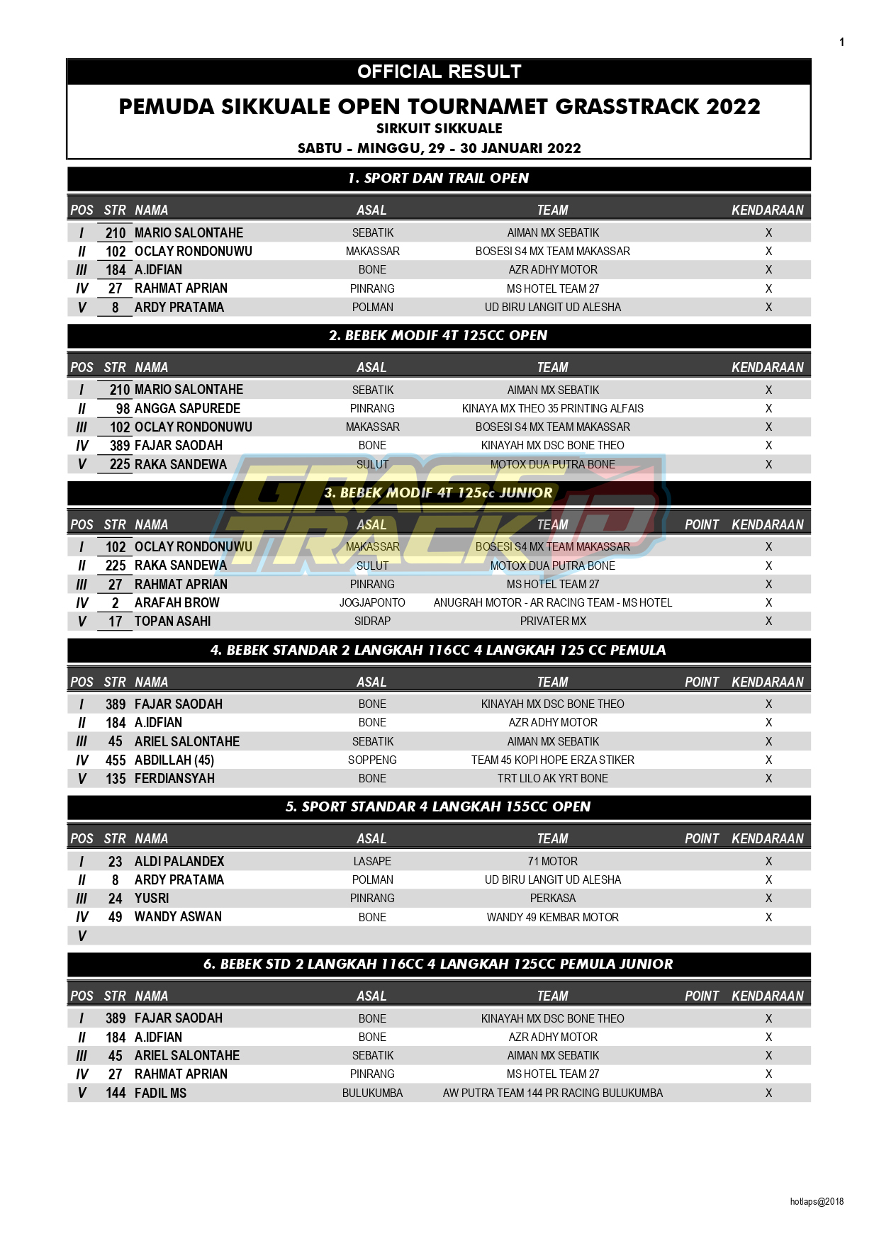 Berikut Hasil Lomba Pemuda Sikkuale Open Tournament Grasstrack 2022 yang diselenggarakan pada tanggal 29-30 Januari 2022 di Sirkuit Sikkuale Kab.Pinrang Sulawesi Selatan