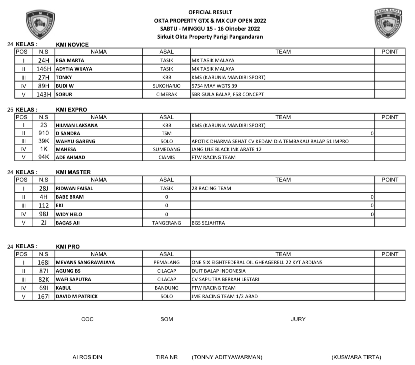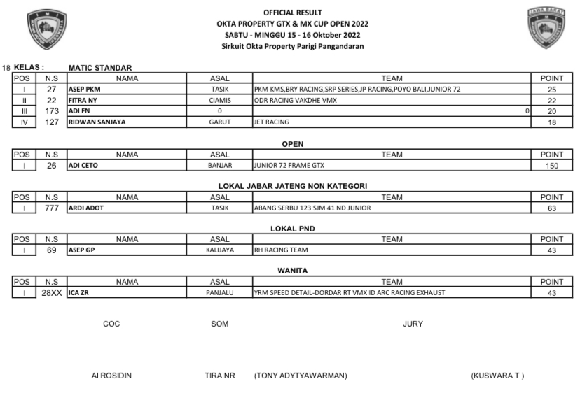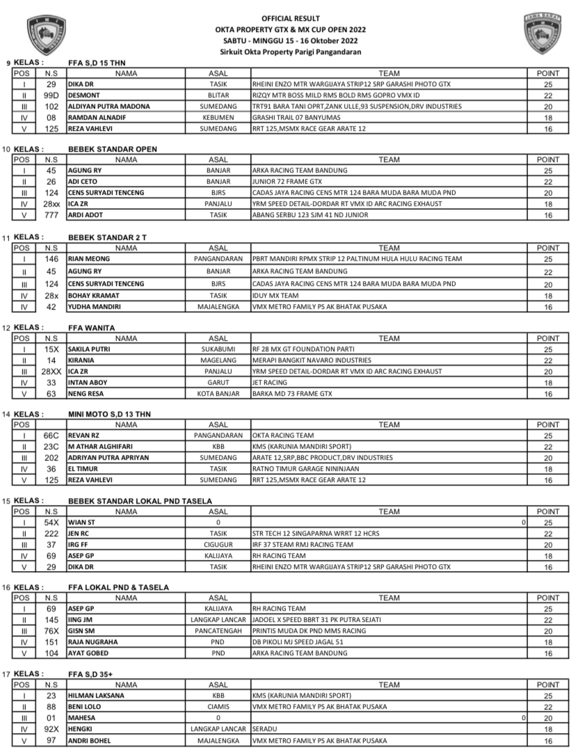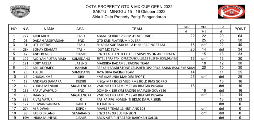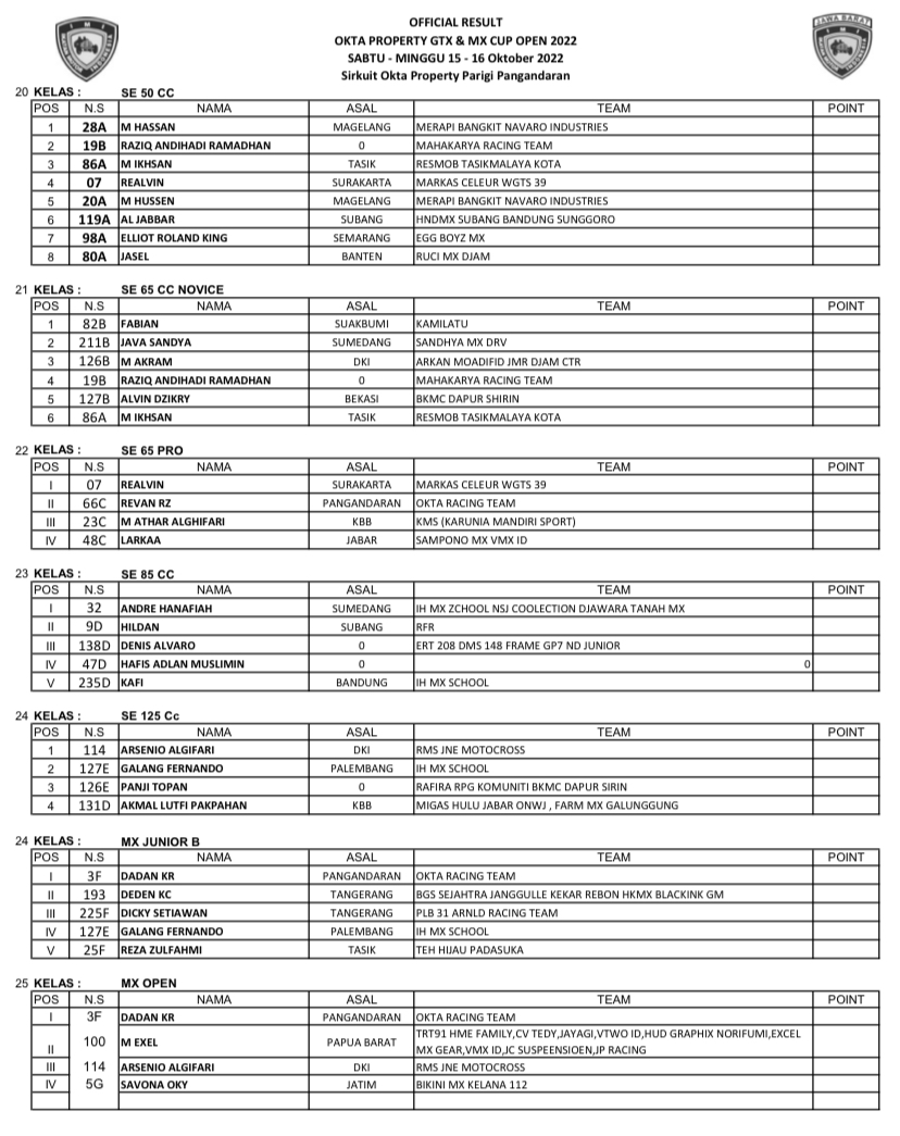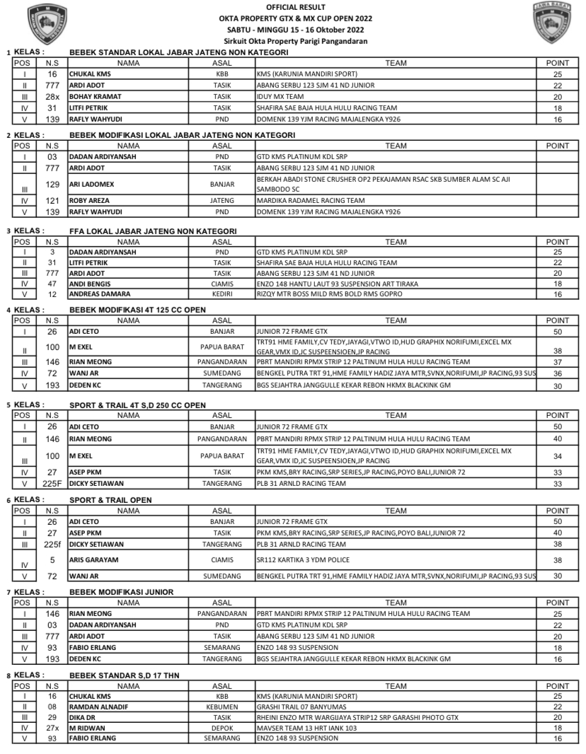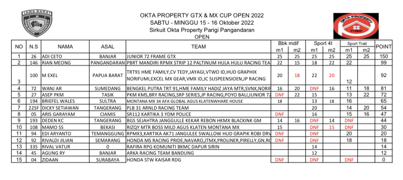 GRASSTRACK ID – Berikut hasil Motocross & Grasstrack Okta Property Cup Open 2022 tanggal 15-16 Oktober 2022 di Sirkuit Okta Property, Pangandaran, Jawa Barat.