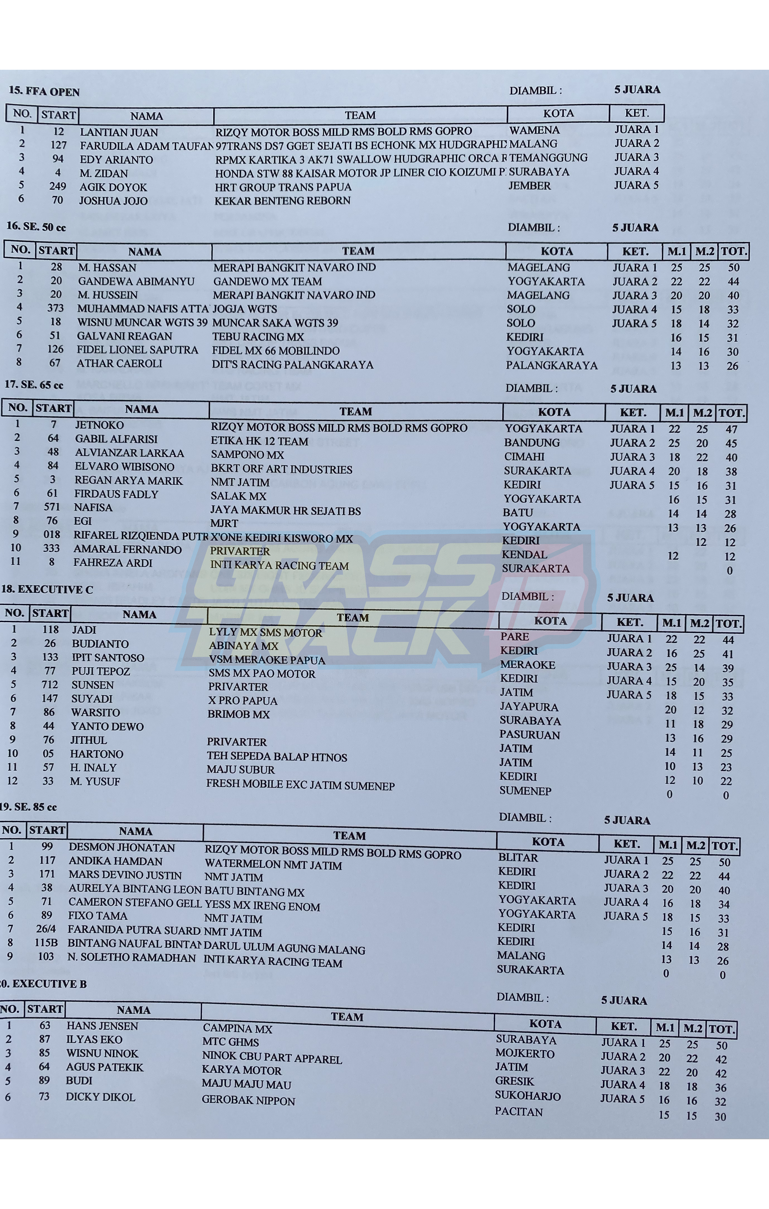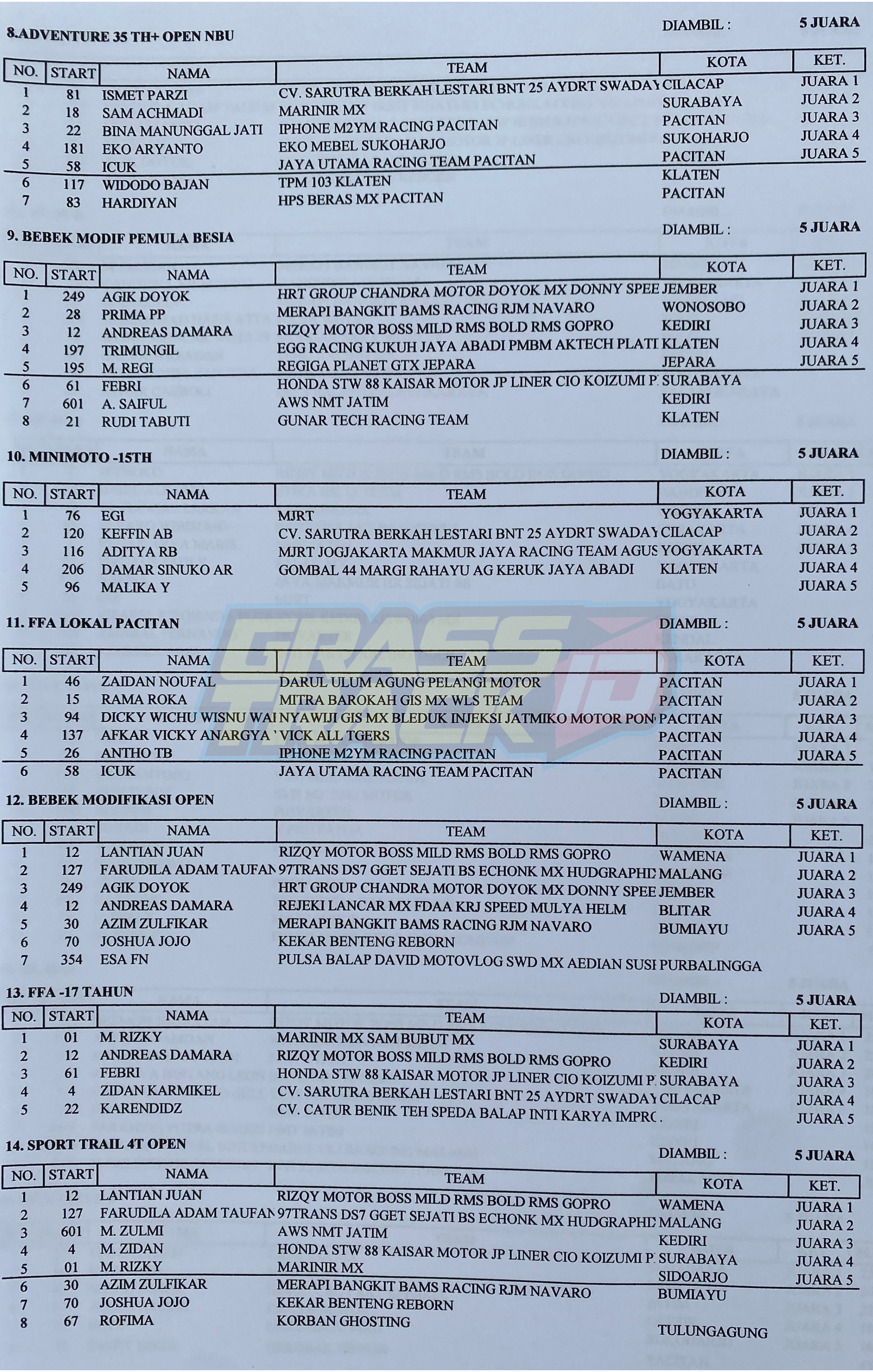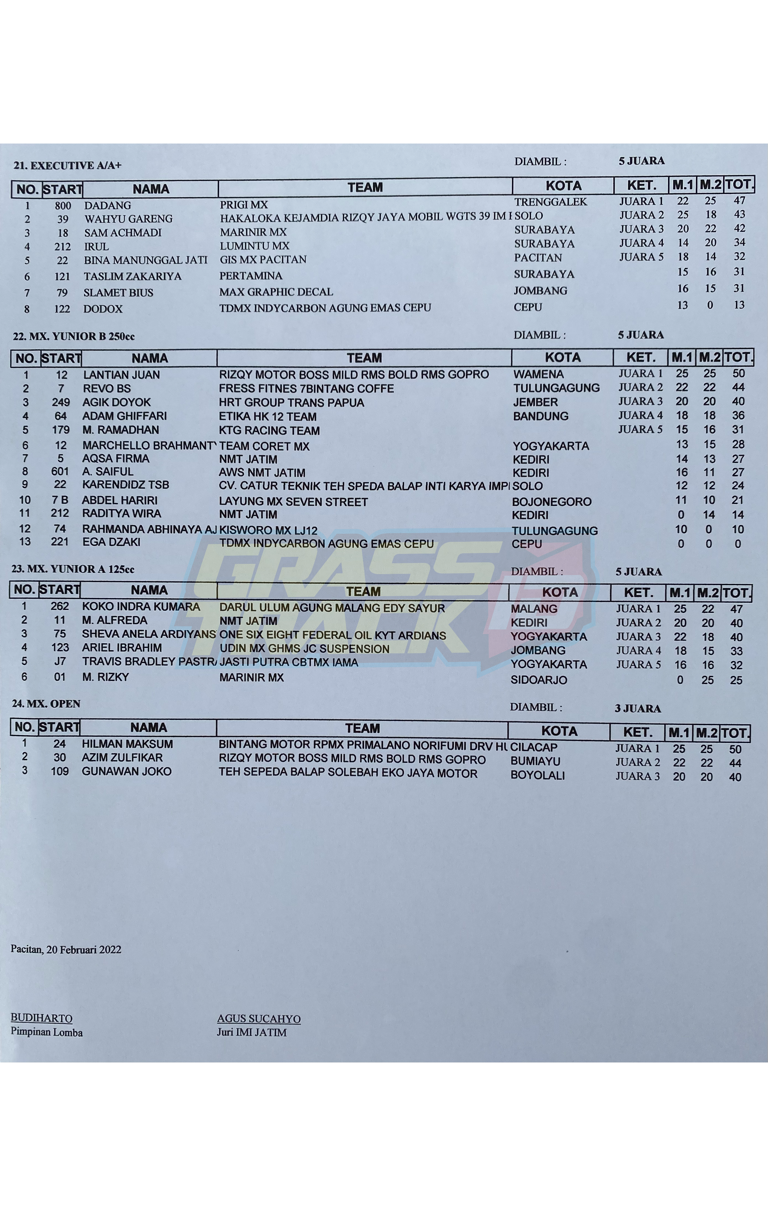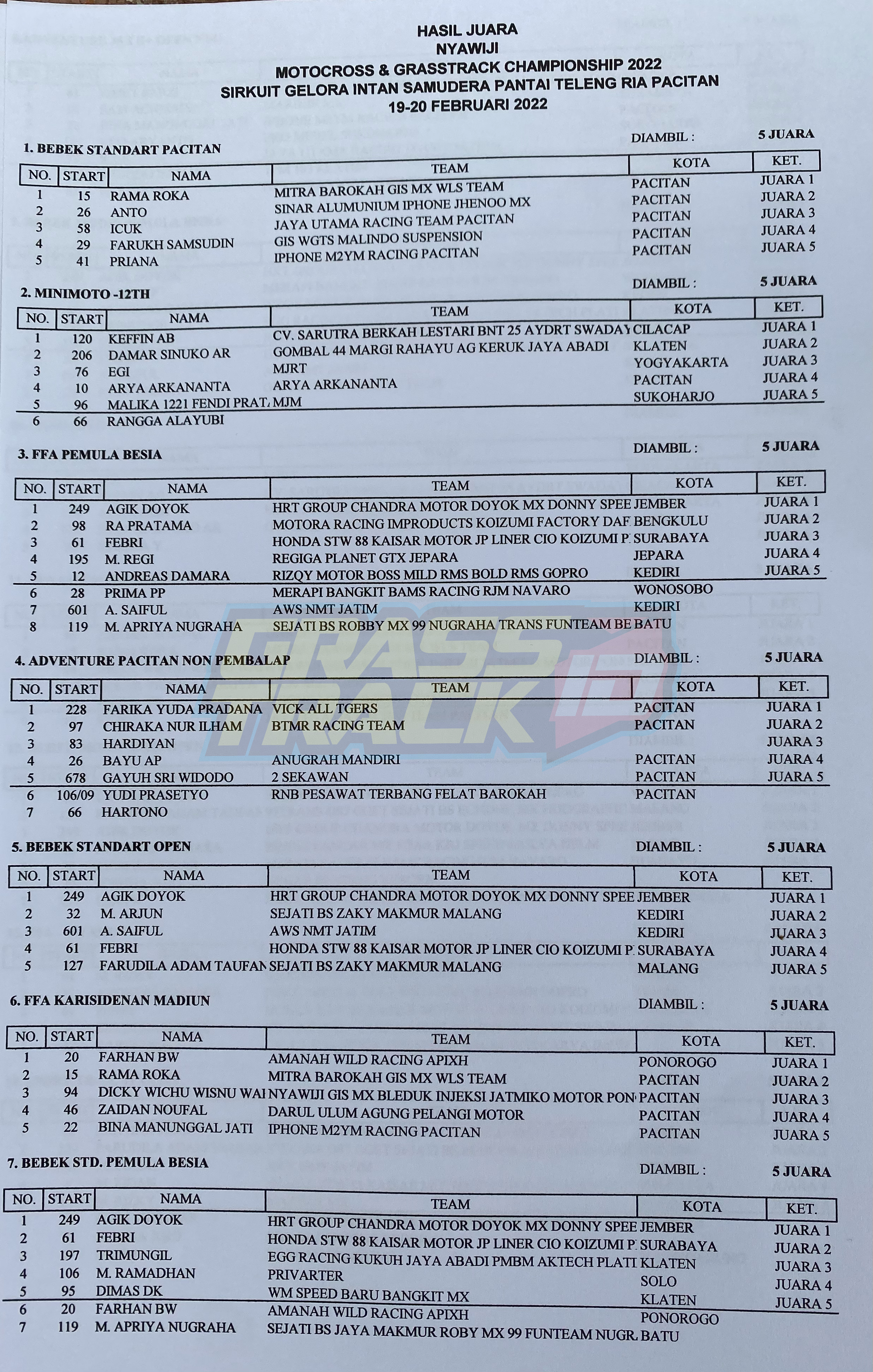 GRASSTRACK ID – Berikut hasil Nyawiji Motocross & Grasstrack 2022 tanggal 19-20 Februari 2022 di Sirkuit Gelora Intan Samudera Pantai Teleng Ria Pacitan Jawa Timur.