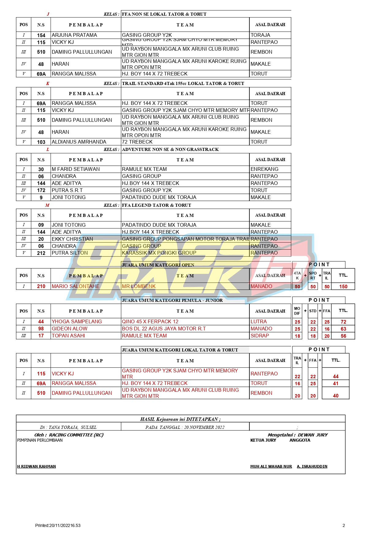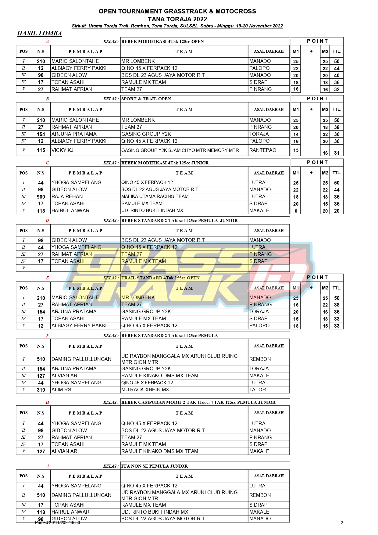 Berikut Hasil Open Tournament Grasstrack & Motocross Tana Toraja 2022 yang digelar pada tanggal 19-20 November 2022 di Sirkuit Utama Toraja Trail Tana Toraja, Sulawesi Selatan.