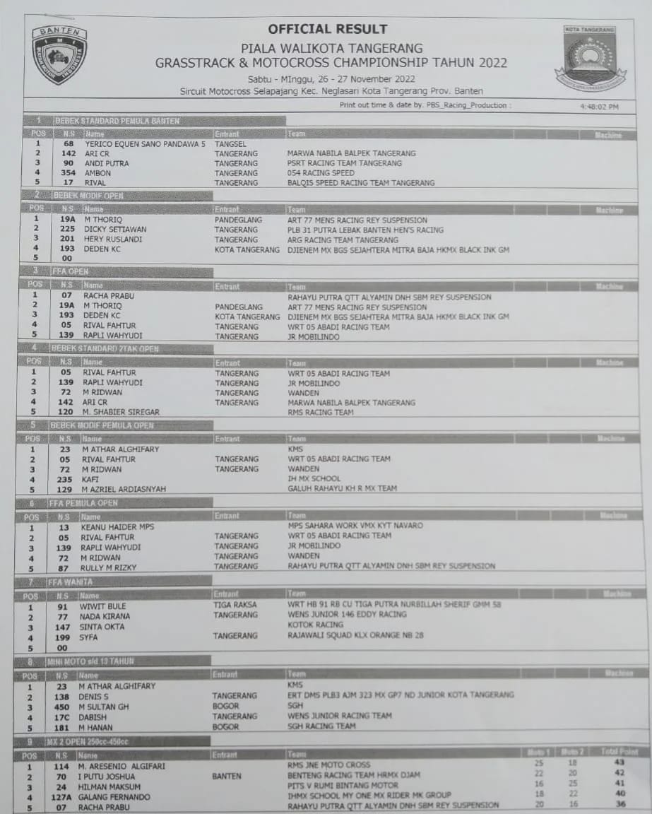 GRASSTRACK ID – Berikut hasil piala walikota tangerang grasstrack & motocross championship 2022 yang digelar tanggal 26-27 November 2022 di Sirkuit Motocross Selapajang, Kec. Neglasari, Tangerang, Banten.