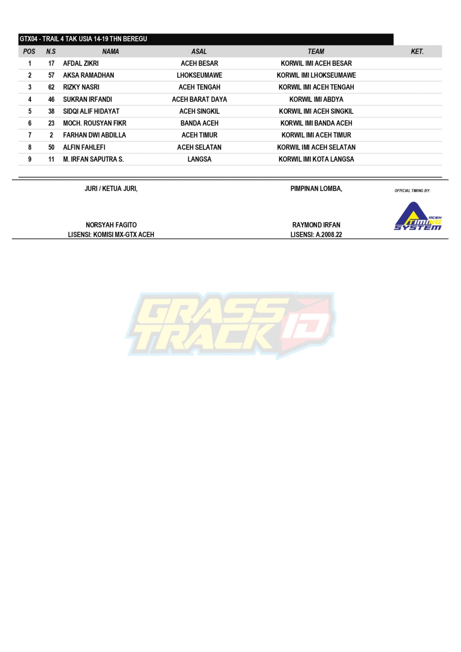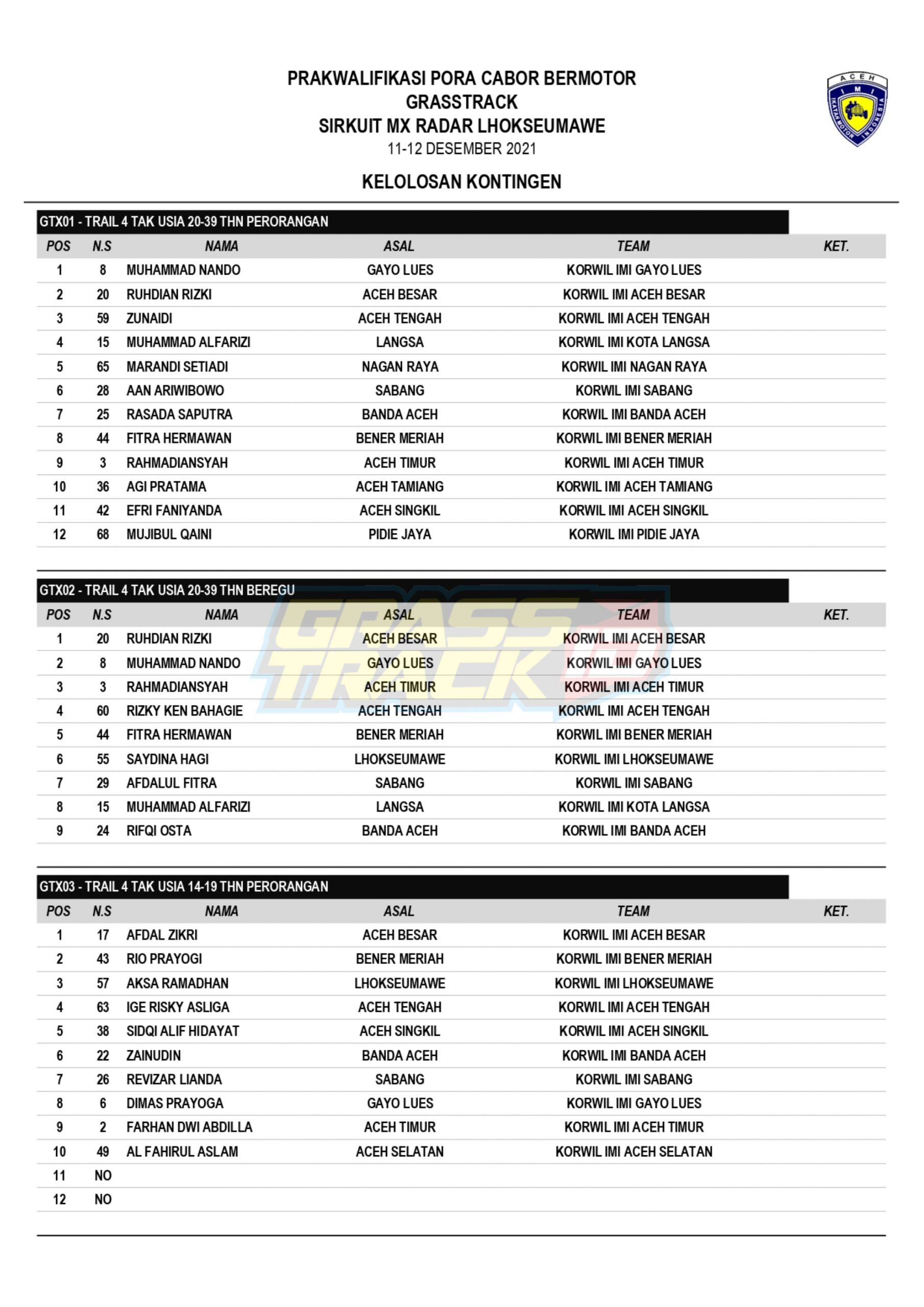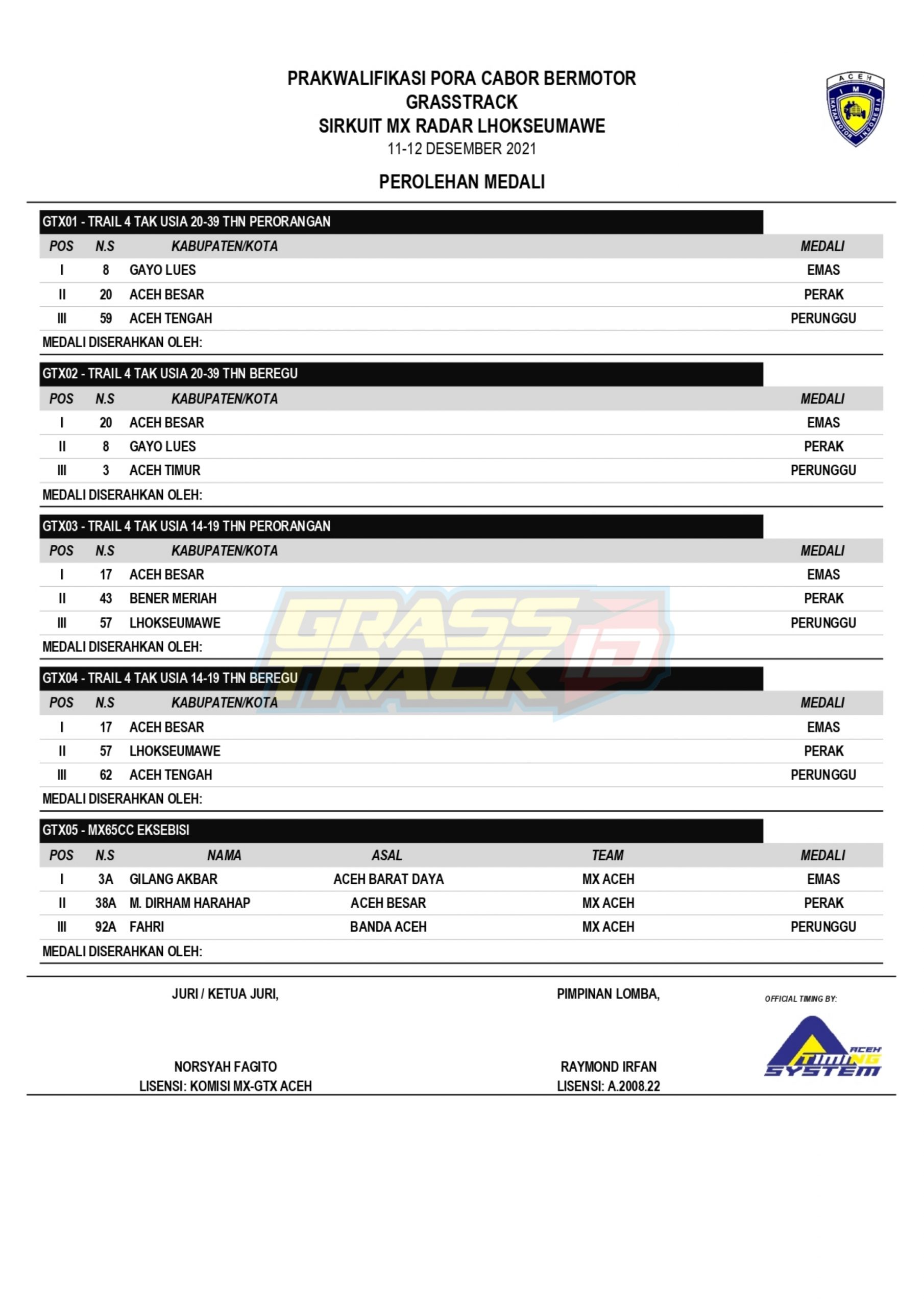 GRASSTRACK.ID- Berikut adalah hasil prapora grasstrack aceh tanggal 12 Desember 2021 di Sirkuit Radar Lhokseumawe