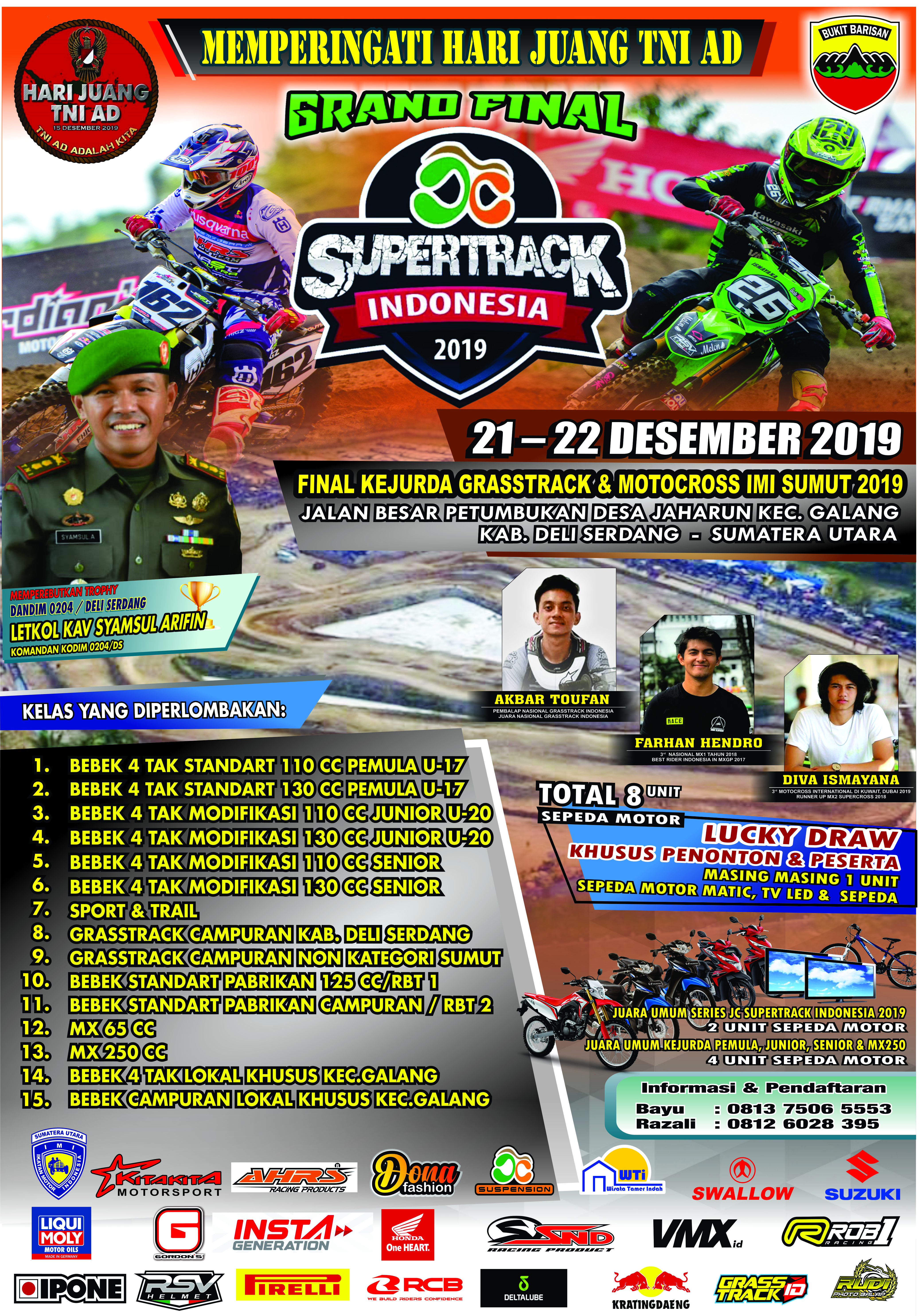 Di samping itu, ternyata tak menutup kemungkinan untuk para peserta yang tidak dapat meraih Juara Umum untuk mendapatkan hadiah Sepeda Motor. Ternyata eh ternyata, Pihak JC Supertrack Indonesia juga telah menyiapkan 1 unit sepeda motor Lucky Draw untuk Peserta di ambil dari setiap pendaftaran dengan syarat menigkuti penuh putaran JC Supertrack Indonesia 2019. Dan sebagai Tradisi dari Jaharun Centre & Circuit yang beralamat di Jalan Besar Pertumbukan Desa Jaharun Kec.Galang Kab.Deli Serdang – Sumatera utara ini, ada 1 unit sepeda motor, LED TV, Sepeda dan masih banyak hadiah menarik lainnya yang akan di bagi-baikan ke Penonton melalui Lucky Draw Ticket Masuk. Wow !