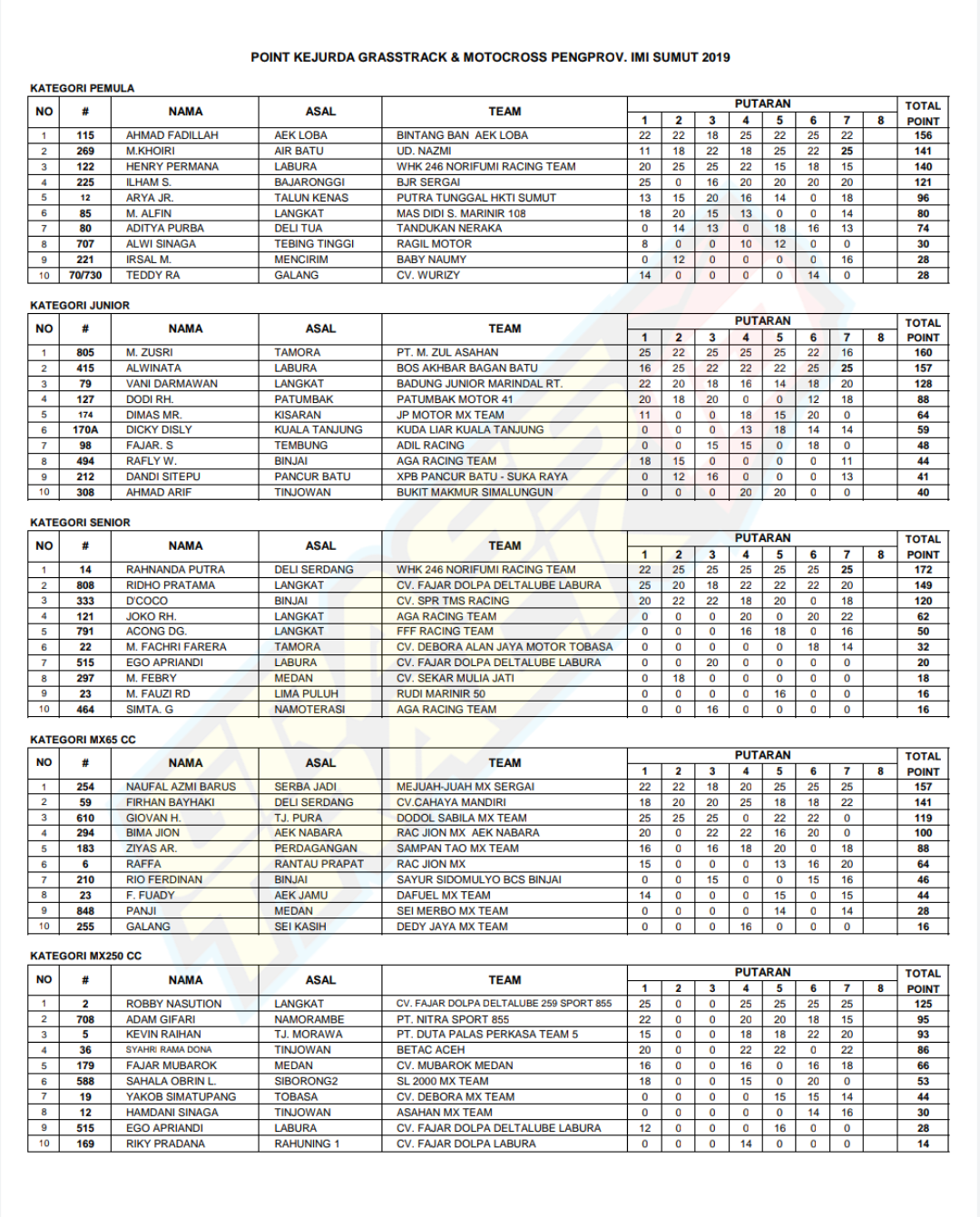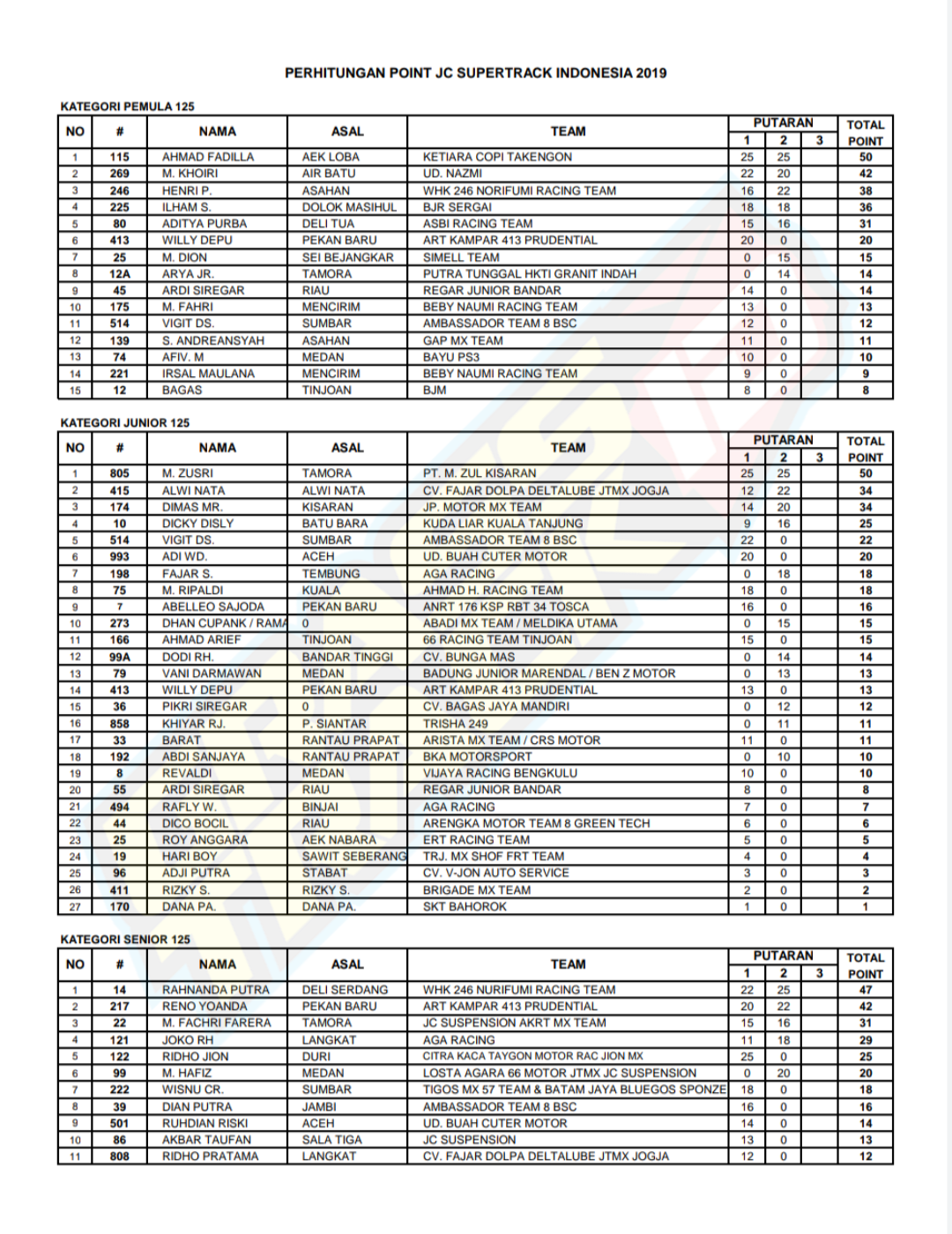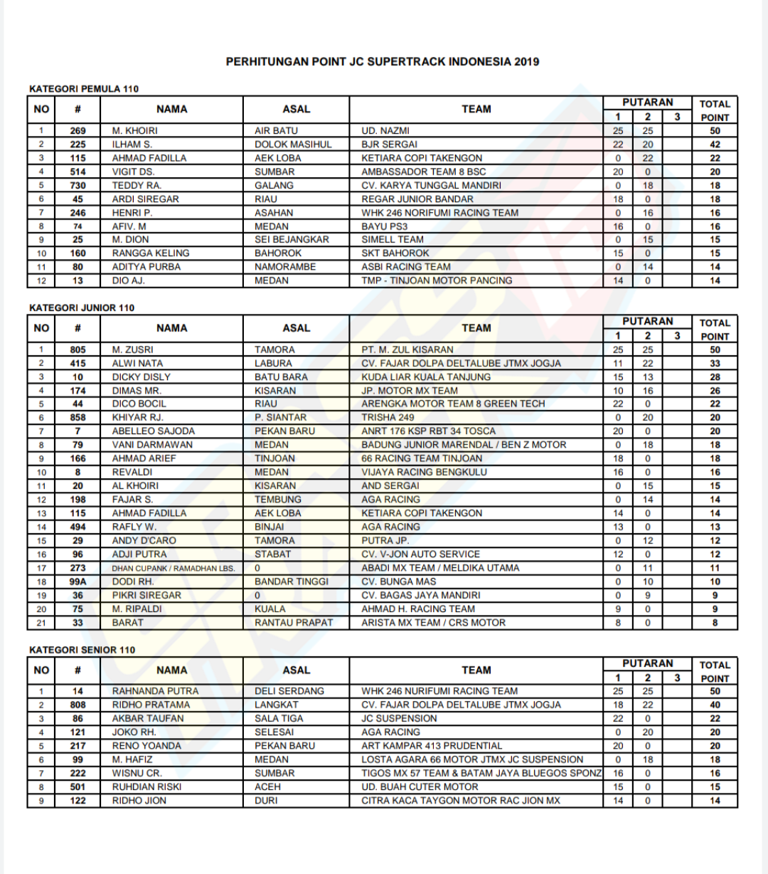 Berikut Perhitungan Point / Klasemen Sementara JC Supertrack Indonesia 2019 dan Kejurda GTX & MX IMI Sumut 2019.