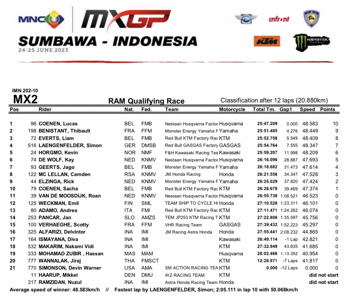 Pebalap team Nestaan Husqvarna Factory, Lucas Coenen berhasil jadi yang tercepat dirace kualifikasi MX2 dan berhak mendapatkan 10 Poin. Point Leader MX2 saat ini, Andrea Adamo hanya finish ke-13 setelah sempat jatuh diawal race.