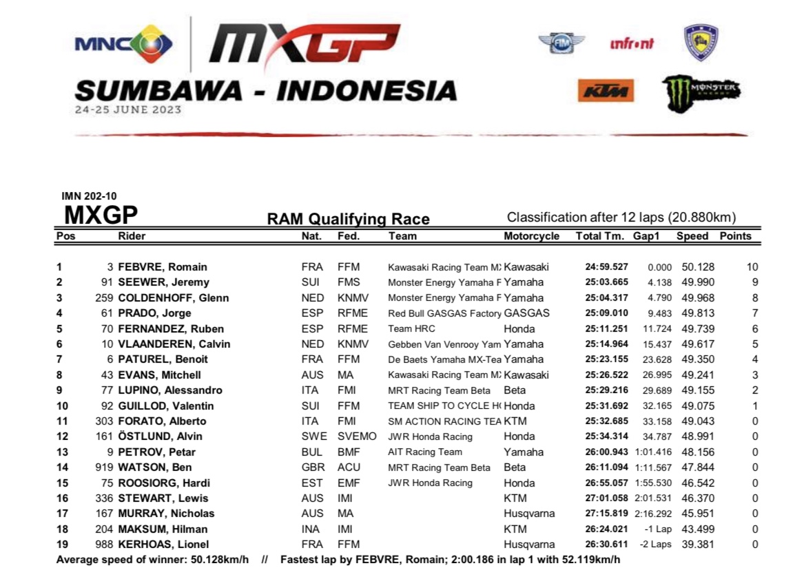 Hasil positif kembali diraih Romain Febvre setelah mencatat waktu tercepat di Time Practice. Febvre berhasil memenangkan Race Kualifikasi MXGP dan meraih 10 Poin.