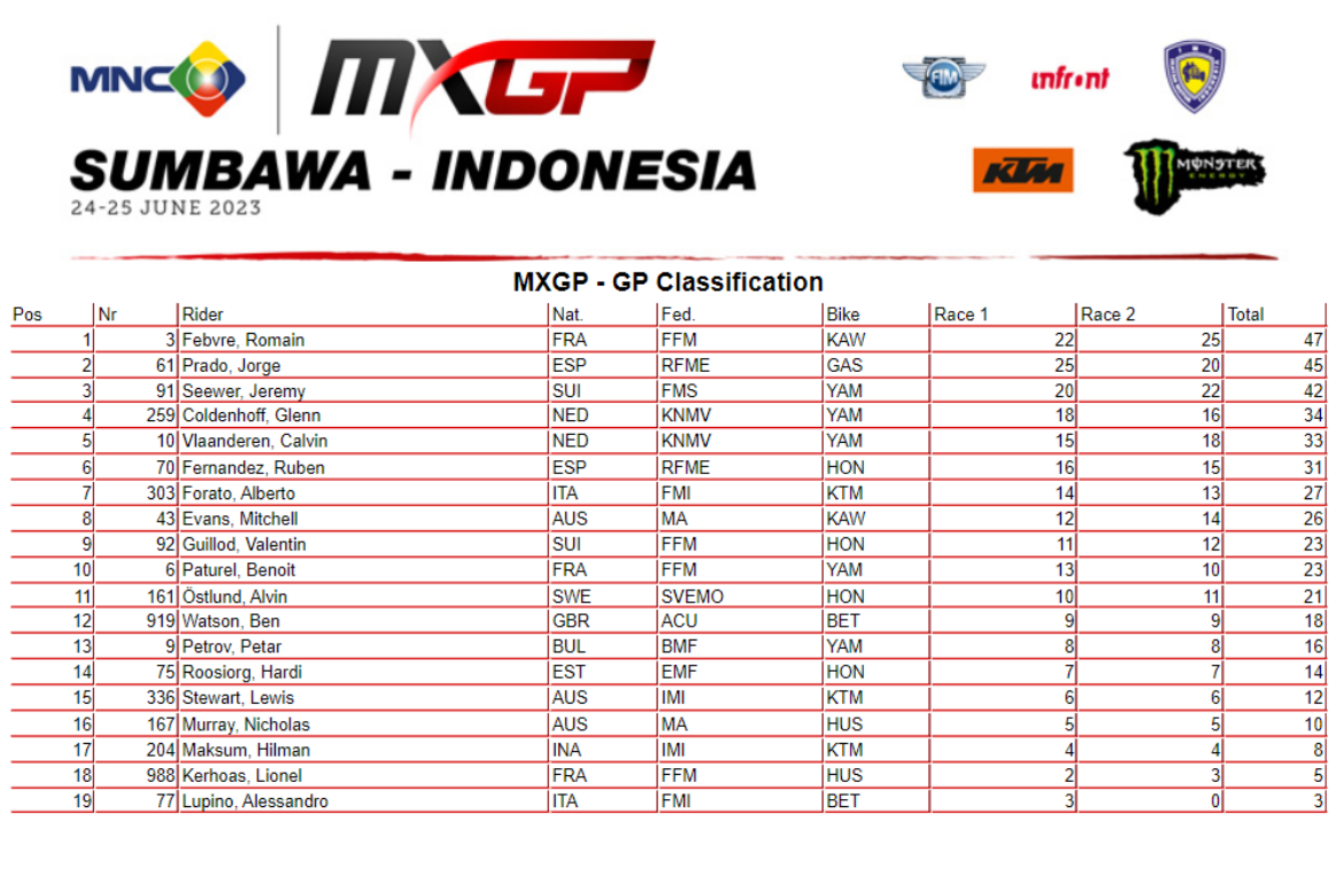 GRASSTRACK ID – Dengan perolehan total poin 47, Romain Febvre berhasil menjadi Juara MXGP Sumbawa – Indonesia.