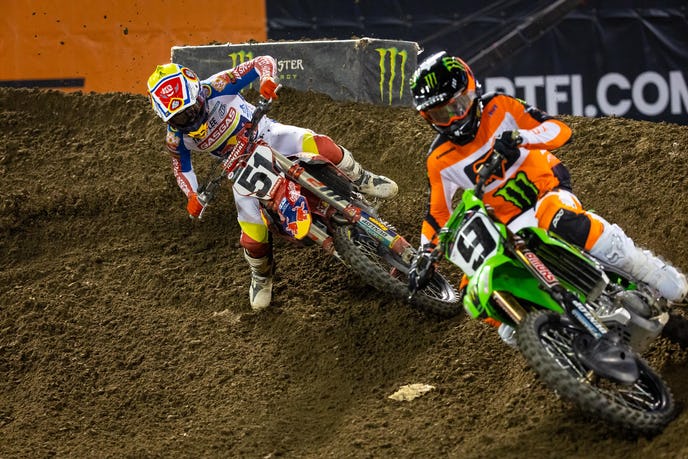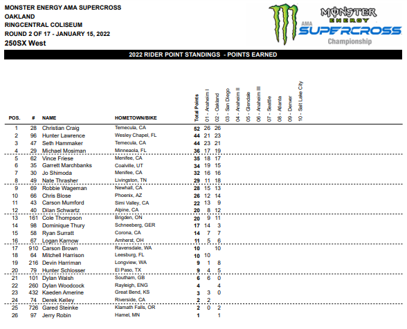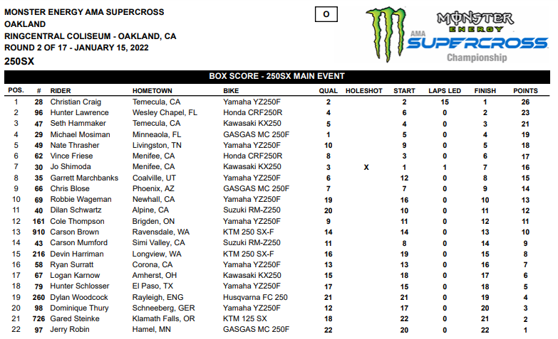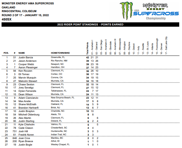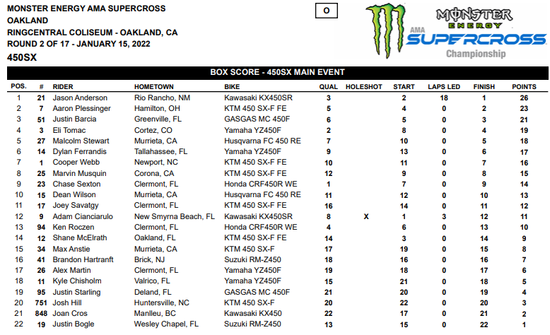 GRASSTRACK ID – Jason Anderson berhasil meraih kemenangan pertamanya bersama Kawasaki musim 2022 ini. Posisi kedua diraih Aaron Plessinger pembalap team KTM dan posisi 3 diraih Justin Barcia. Berikut merupakan hasil dan update klasemen AMA Supercross 2022 Oakland.