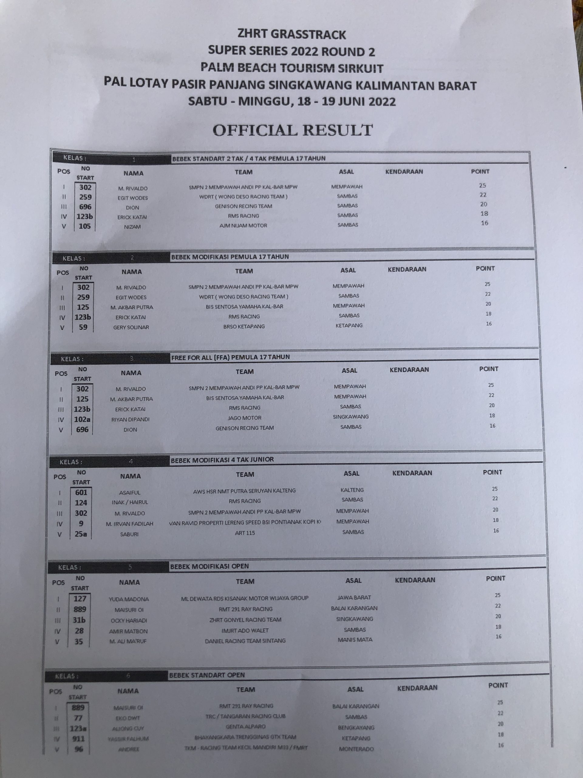 GRASSTRACK ID – Berikut hasil ZHRT Grasstrack Super Series 2022 Round 2 tanggal 18-19 Juni 2022 di Sirkuit Pal Lotay Pasir Panjang, Singkawang, Kalimantan Barat.